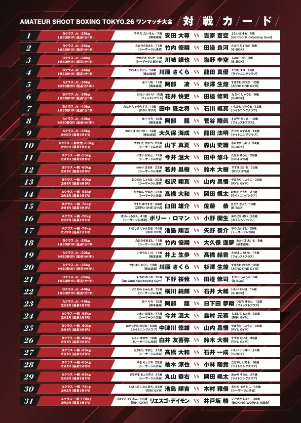 【全カード&試合順】AMATEUR SHOOT BOXING TOKYO.26 〜ワンマッチ大会〜