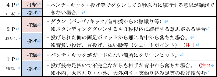 1. パンチ・キック等の打撃や、背負い投げ等の投げの有効技により、的確かつ有効な攻撃が認められ相応のダメージを与える、また一本/技あり/有効打により4ポイントを 先取することによって勝敗を決定する。