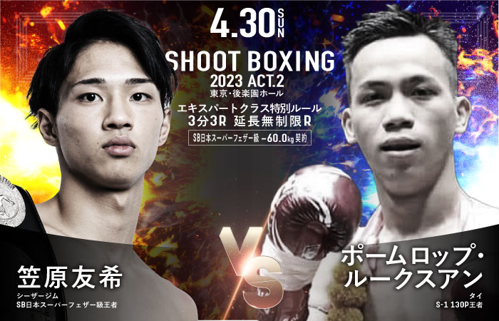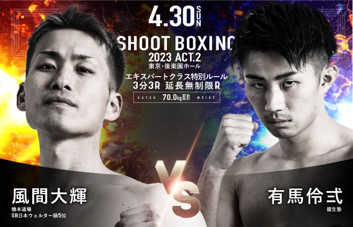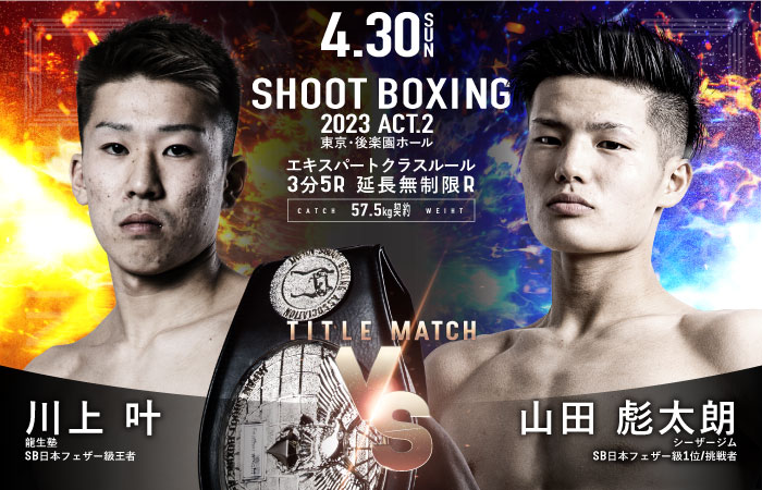 SB日本フェザー級(57.5kg契約)タイトルマッチで王者・川上叶(龍生塾)vs同級1位・山田彪太朗(シーザージム)の一戦が決定。川上は12勝のうち5つのKO勝ちがあるSB関西期待のホープ。2022年4月にSB日本フェザー級王座決定戦で魁斗を下して新王者に輝き、バンタム級に続いて二階級制覇を達成した。昨年12月の『RISE WORLD SERIES/SHOOT BOXING KNGS 2022』では圧倒的パフォーマンスで当時15連勝中とノリに乗っていた安本晴翔と対戦し、下馬評を覆して判定勝利。今年3月にはタイのガオパヤックを倒して3連勝と好調を維持する。