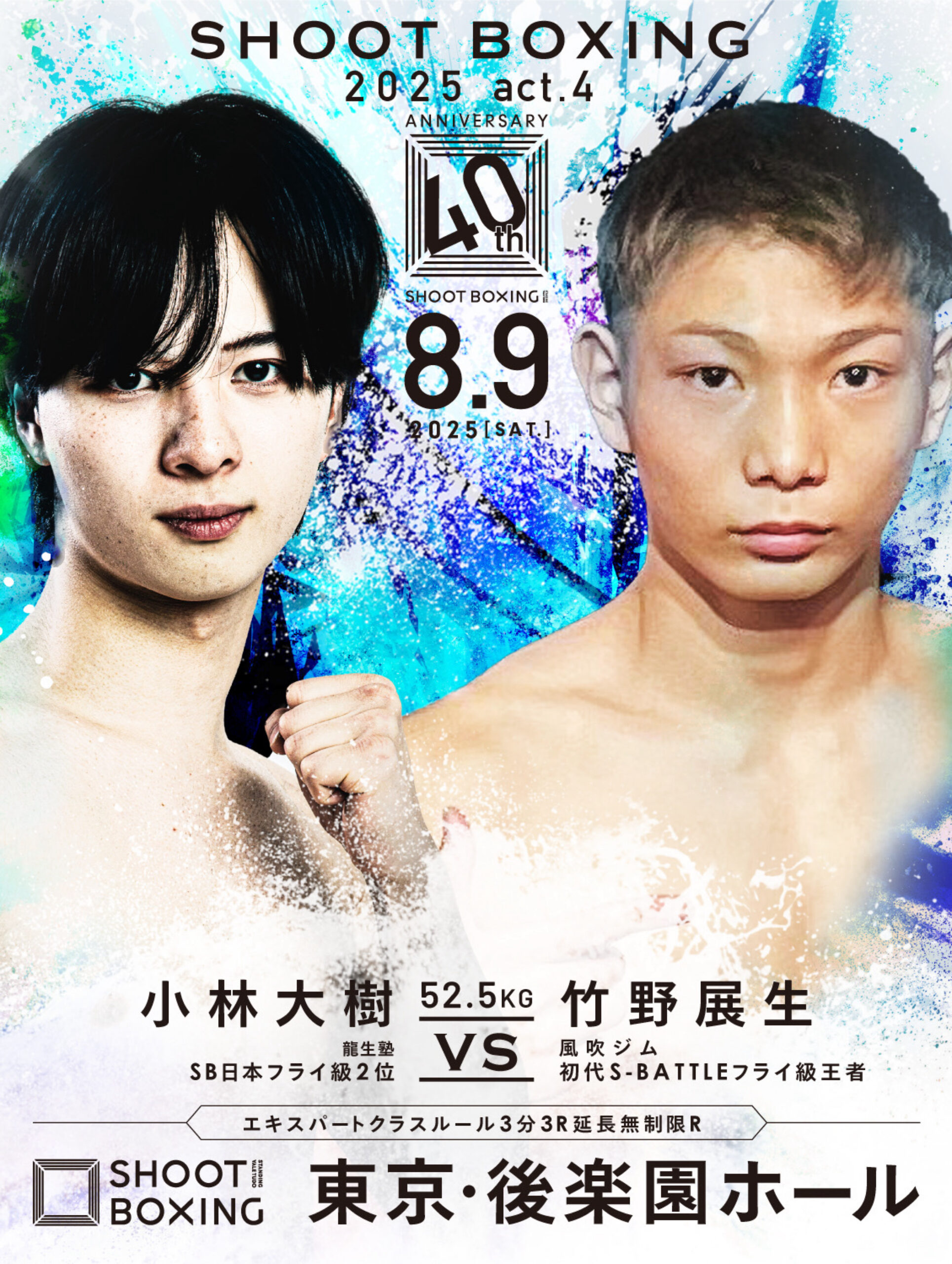 SHOOT BOXING 40周年イヤーを象徴する一大決戦が後楽園ホールで開催。4階級制覇を狙う笠原弘希が、SB日本スーパーライト級王者・イモト・ボルケーノに挑む頂上決戦を筆頭に、SB最強ツインズ・山田ツインズやRISE王者・安本晴翔が、ムエタイ強豪勢との国際戦に挑む。OFGルール、国内注目カードも揃い、SBの進化と激闘が詰まった真夏の激戦をお見逃しなく!