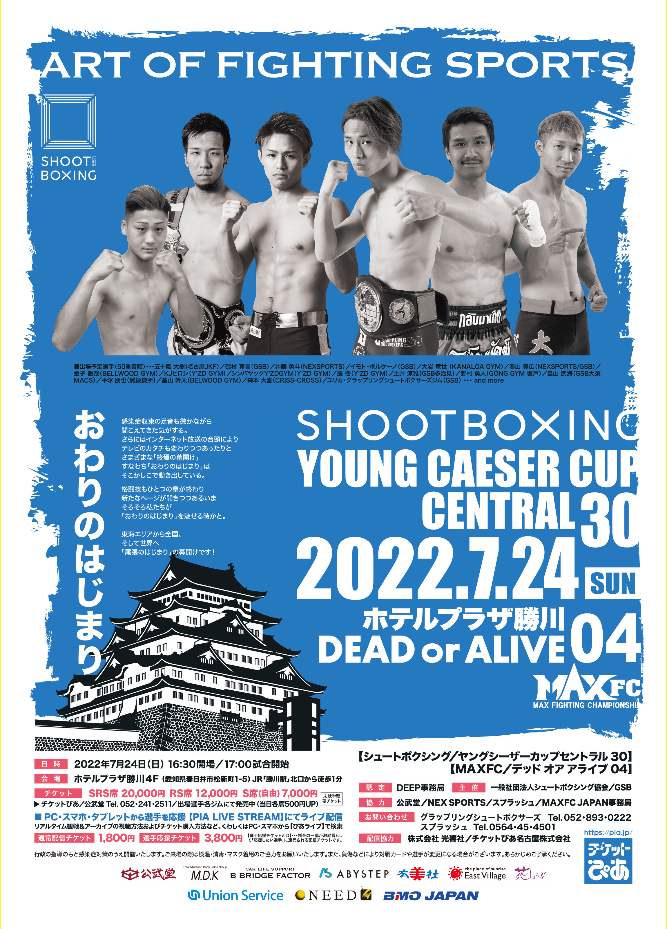 2022年7月24日(日)愛知・ホテルプラザ勝川で開催される『SHOOTBOXING 2022 YOUNG CAESER CUP CENTRAL #30 “DEAD or ALIVE 04”』の主要対戦カードが発表された。