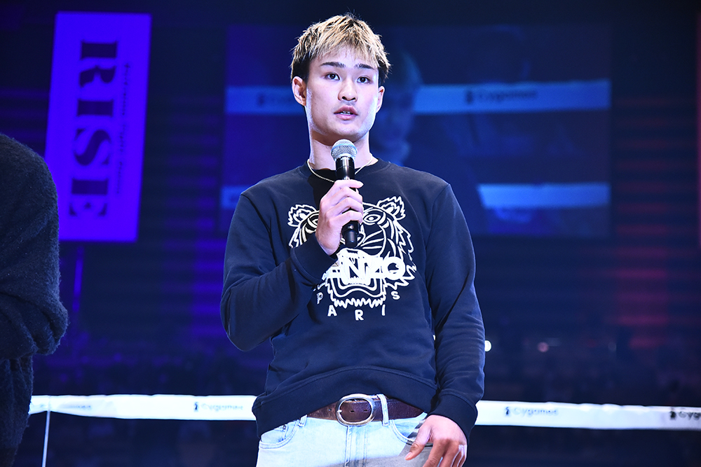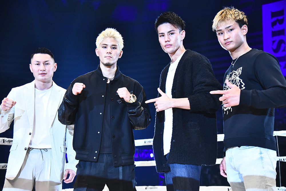 10月15日(土)東京・大田区総合体育館で開催された『Cygames presents RISE WORLD SERIES 2022』のリング上に、その年末のビッグマッチに参戦するSBから海人(TEAM F.O.D)、笠原弘希(シーザージム)、RISEから原口健飛(FASCINATE FIGHT TEAM)と山田洸誓(正道会館KCIEL)の4選手が登場し、ファンの前であいさつした。