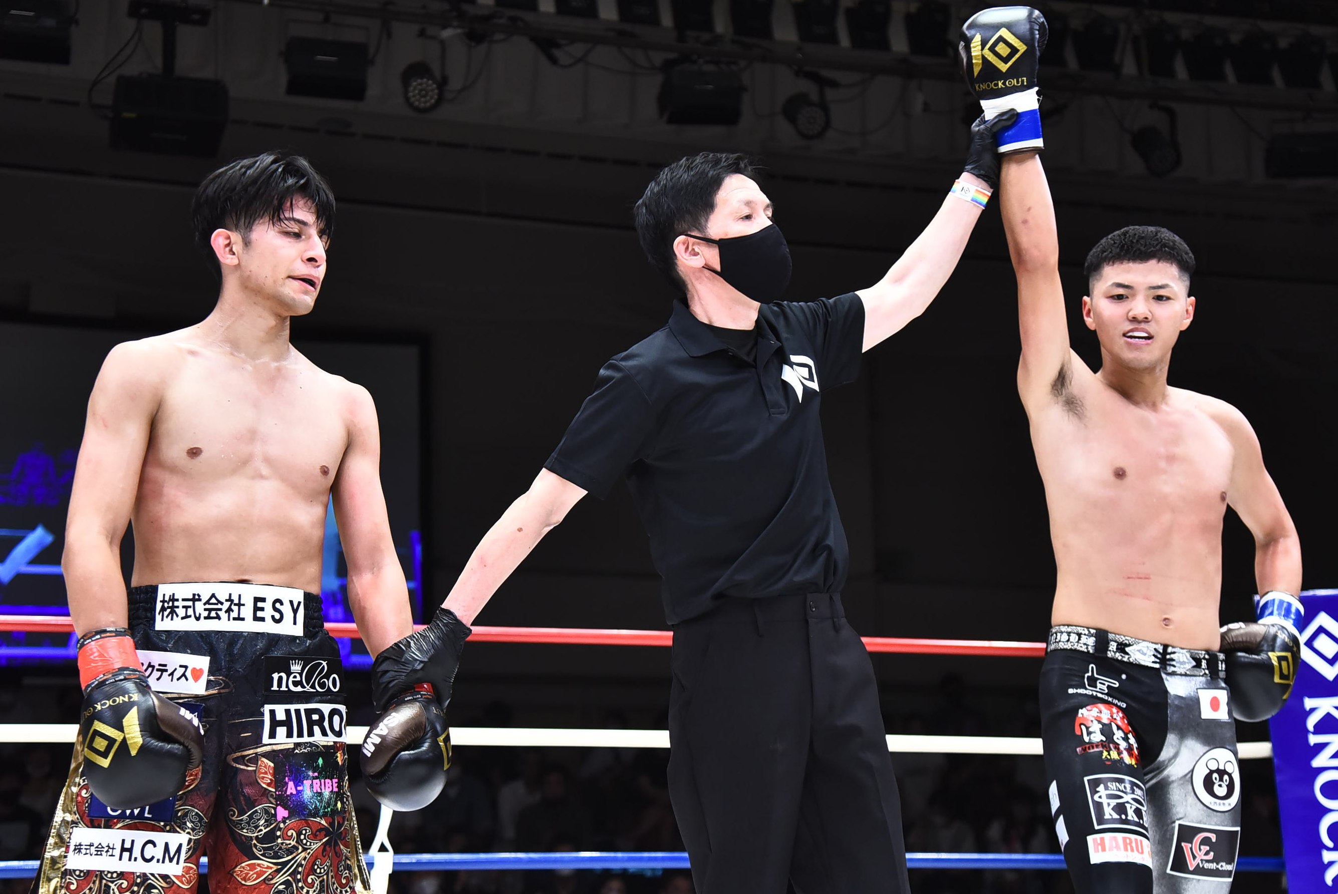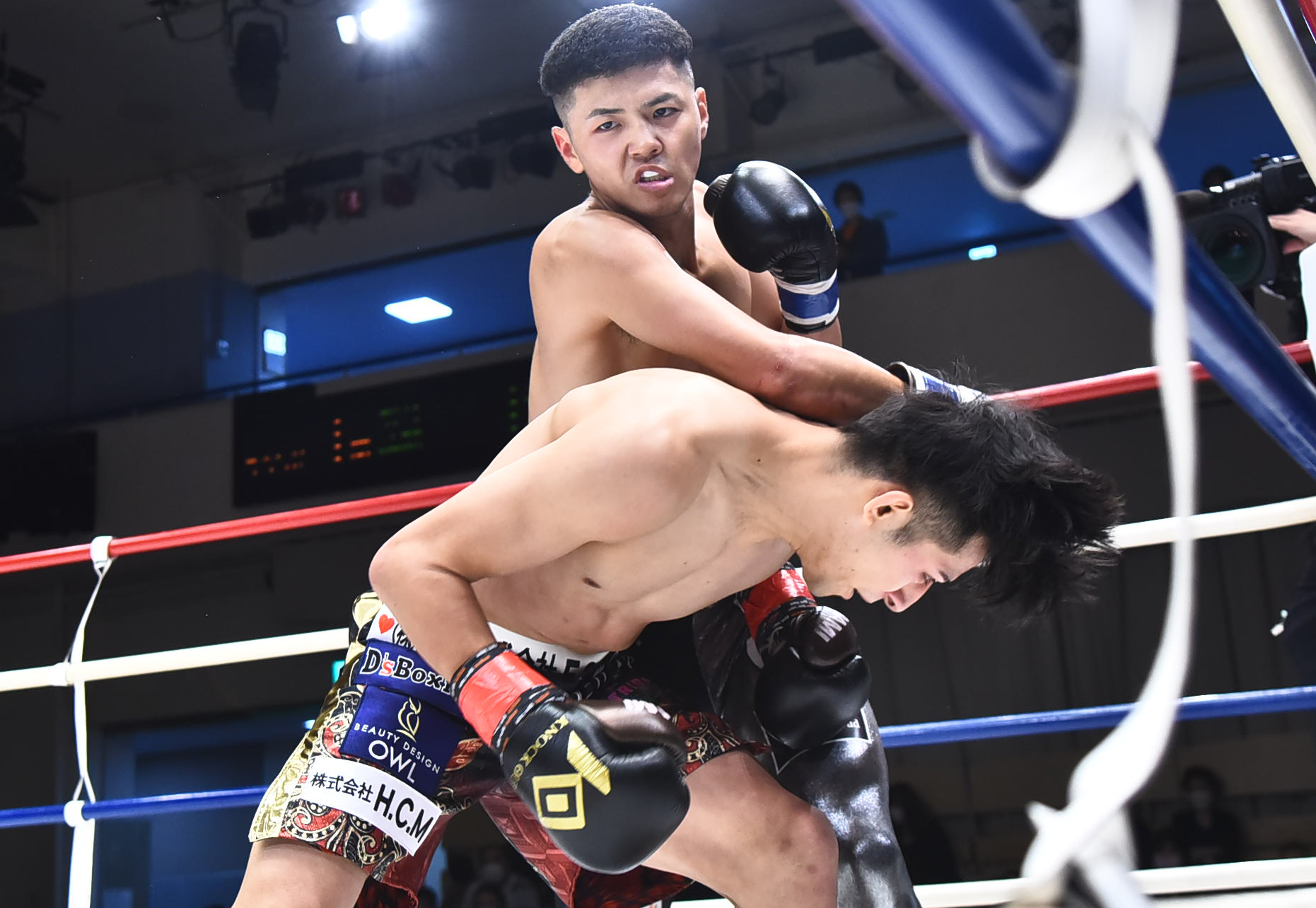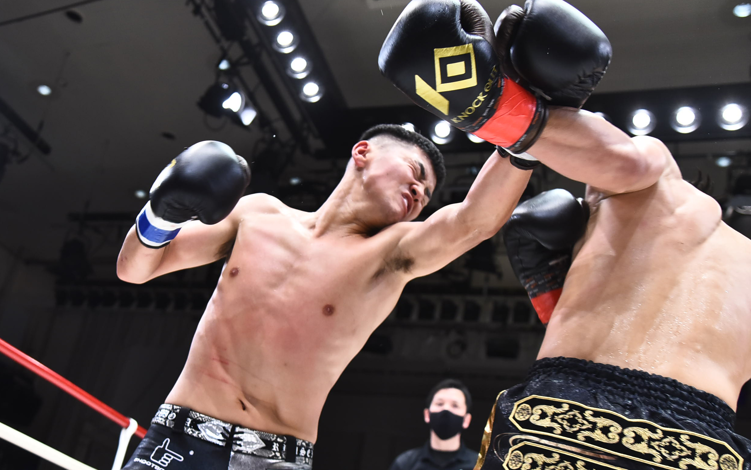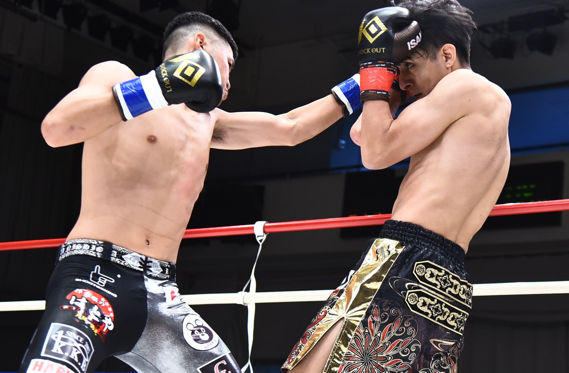 1Rから右カーフキックを混ぜて手数で前に出る西岡に、鈴木もカーフを入れつつパンチにつないでイーブンの展開。2R、圧力を強める西岡が右フックをカウンターで合わせ鈴木はバランスの崩させる。3Rもワンツー、左右フックとヒットを奪いリードする西岡は、鈴木のパンチにテンカオも合わせていく。最後にパンチ連打で鈴木をコーナーに追い込んだところで試合終了。