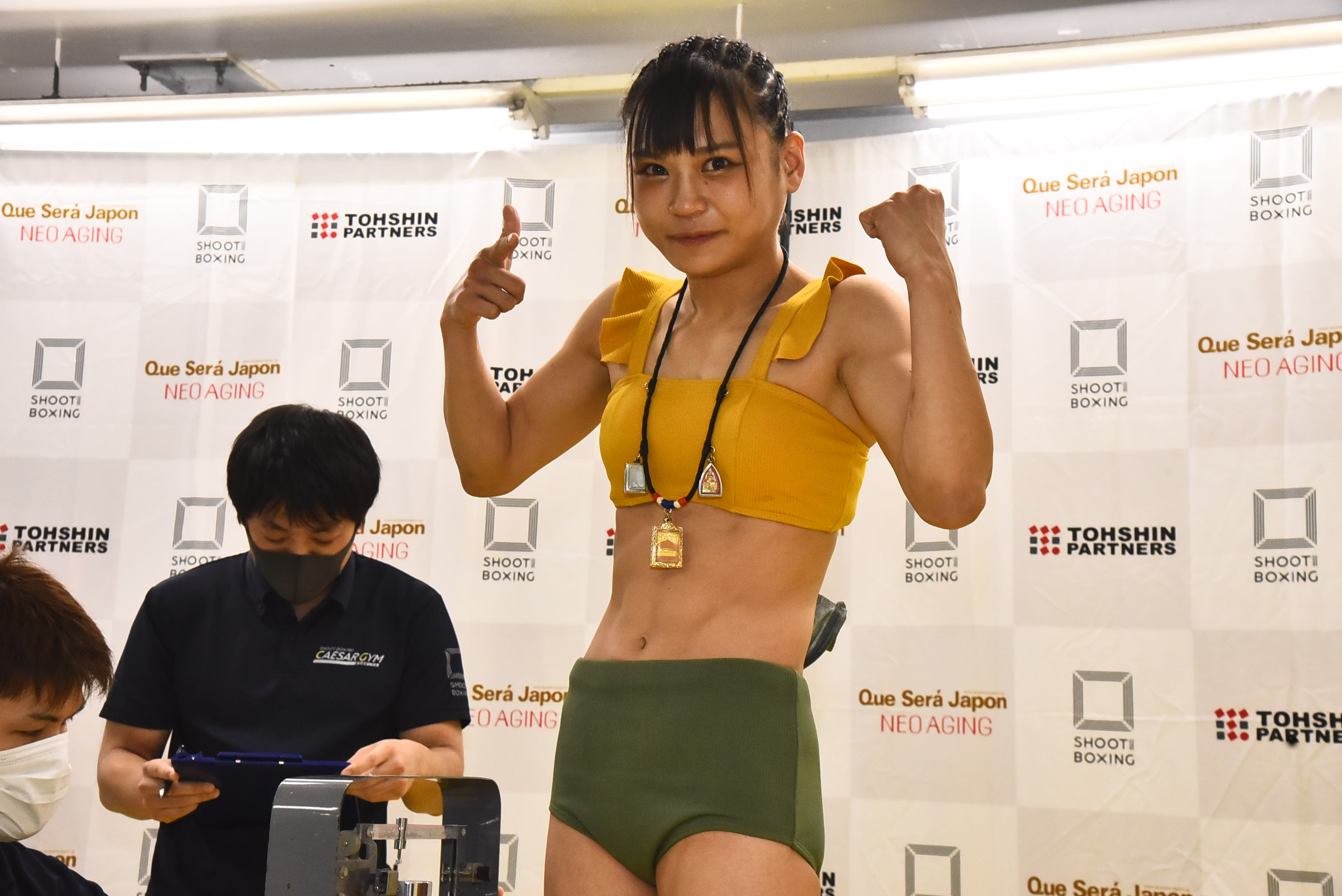 また、セミファイナル(49.0kg契約)で対戦する風羽(龍生塾ファントム道場)は46.7kg、YUMIN(LEO GYM)は48.9kgで計量をクリアー。植山征紀が所属する龍生塾ファントム道場の一押し女子ファイターの風羽は今年5月にRISEのリングでプロデビューを果たしたばかり。2戦目に向けては「パンチを強化してきました。パンチと蹴りの両方を出して倒して勝ちます」とKOを予告。