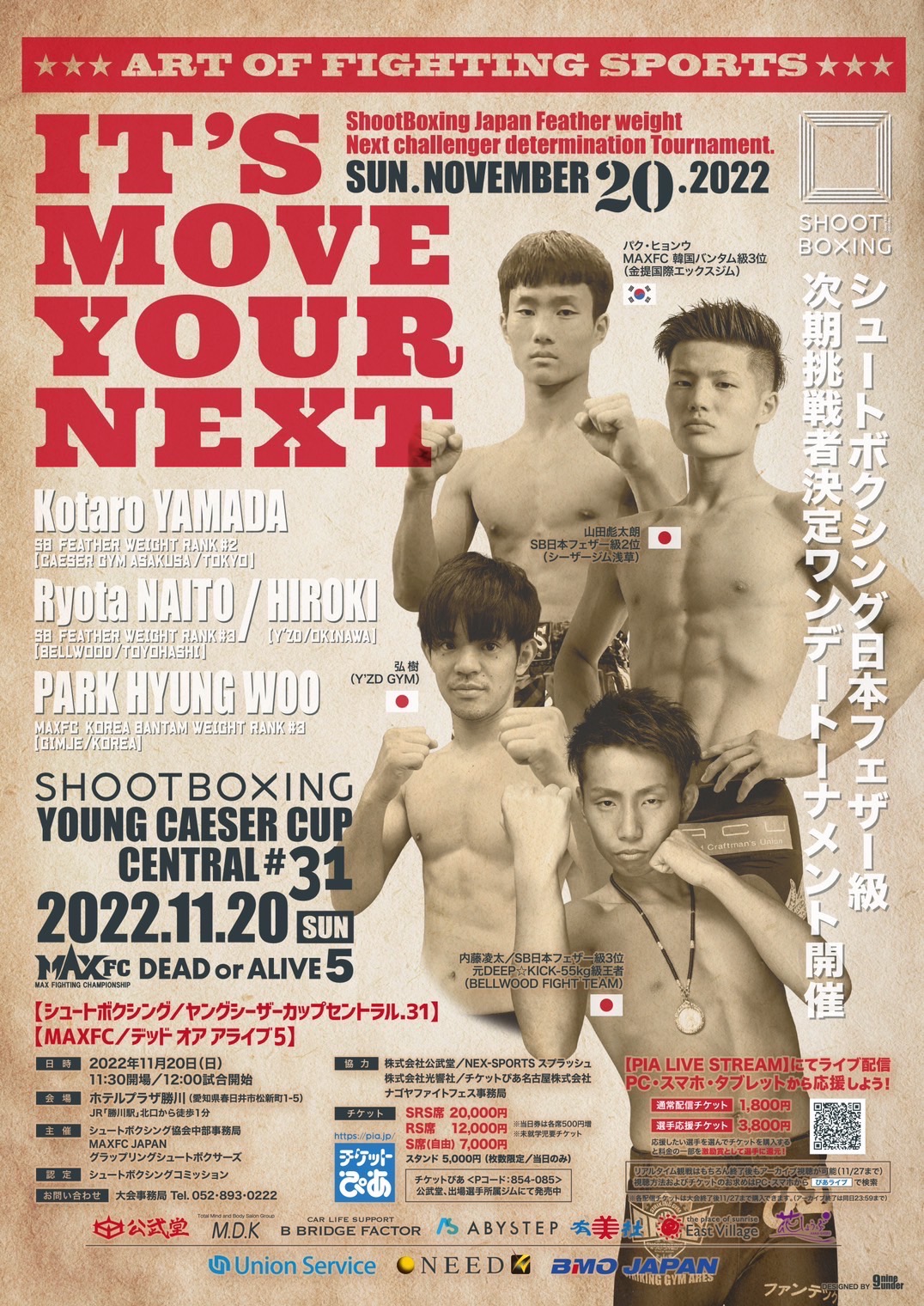 2022年11月20日(日)愛知・ホテルプラザ勝川で開催される『SHOOTBOXING 2022 YOUNG CAESER CUP CENTRAL #31“DEAD or ALIVE 05”』の主要対戦カードが発表された。