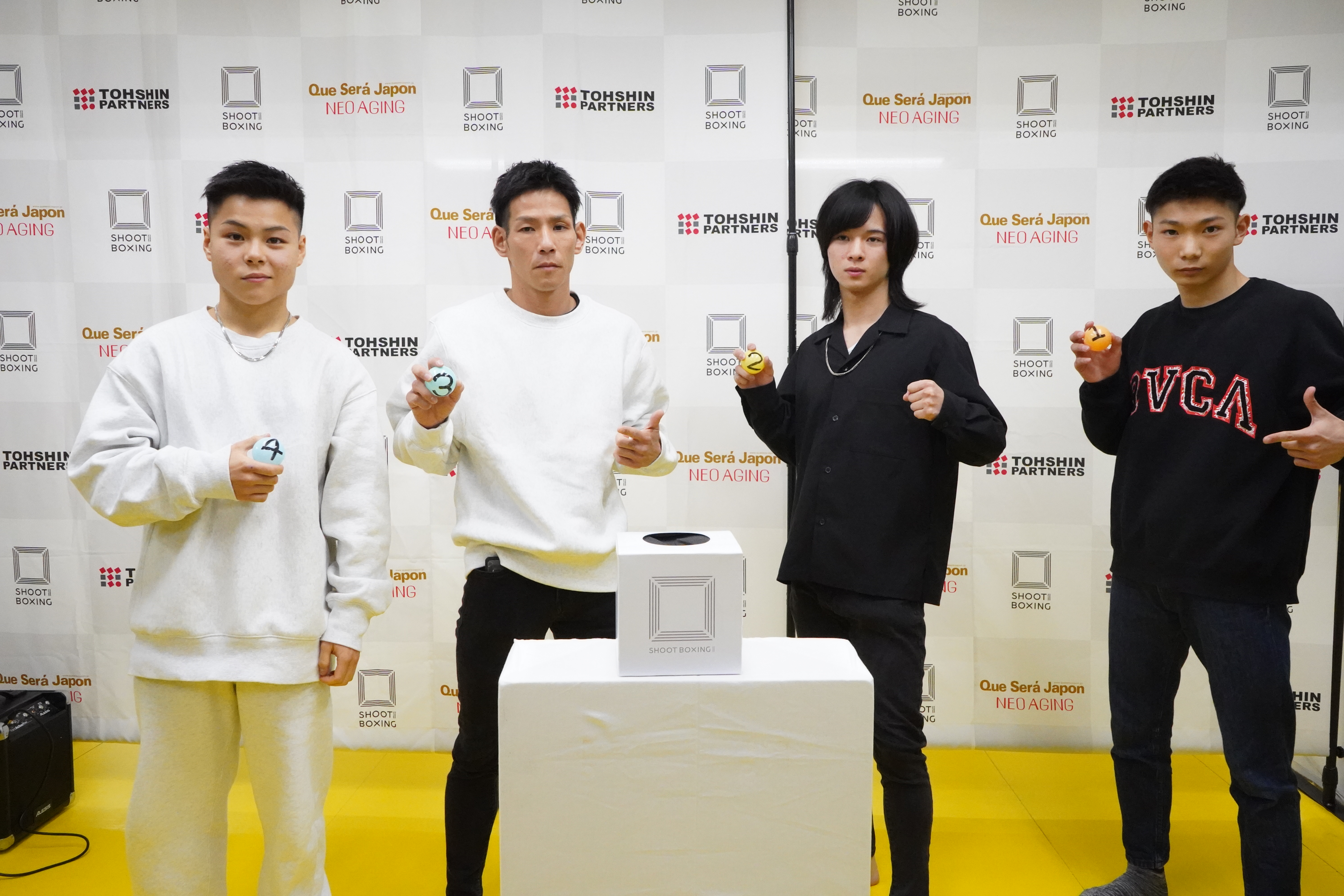 今大会ではランキング入りをかけたバンタム級の若手選手4名によるワンデートーナメント「YOUNG CAESAR TOURNAMENT 2022」が行われ、遠藤凌夢(龍生塾ファントム道場)、長谷川大祐(TEAM FOREST)、小林大樹(龍生塾)、竹野展生(風吹ジム)のまだキャリアの浅いフレッシュなファイターが出場。この日、一回戦の組み合わせ抽選会が前日計量時に行われ、遠藤vs長谷川、小林vs竹野の2カードに(遠藤は52.3kg、長谷川は52.0kg、小林は51.8kg、竹野は52.5kgで計量をパス)した。