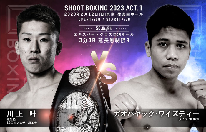 また、SB日本フェザー級王者・川上叶(龍生塾)の相手はガオパヤック・ワイズディー(タイ)に決定。ガオパヤックはスイッチしながらローキック、パンチ連打でKOを狙うアグレッシブなムエタイファイター。対する川上は、昨年12月に両国国技館で開催された『RISE WORLD SERIES/SHOOT BOXING KNGS 2022』にて、圧倒的パフォーマンスで当時15連勝中とノリに乗っていた安本晴翔と対戦し、下馬評を覆して判定勝利を収め、川上を鍛え上げ太鼓判を押していた“名伯楽”吉鷹弘の言葉を証明してみせた。今回ムエタイ戦士と初対戦となる川上がどのような試合を展開するのかに注目だ。