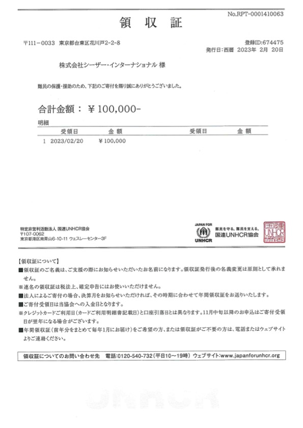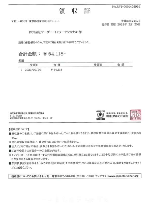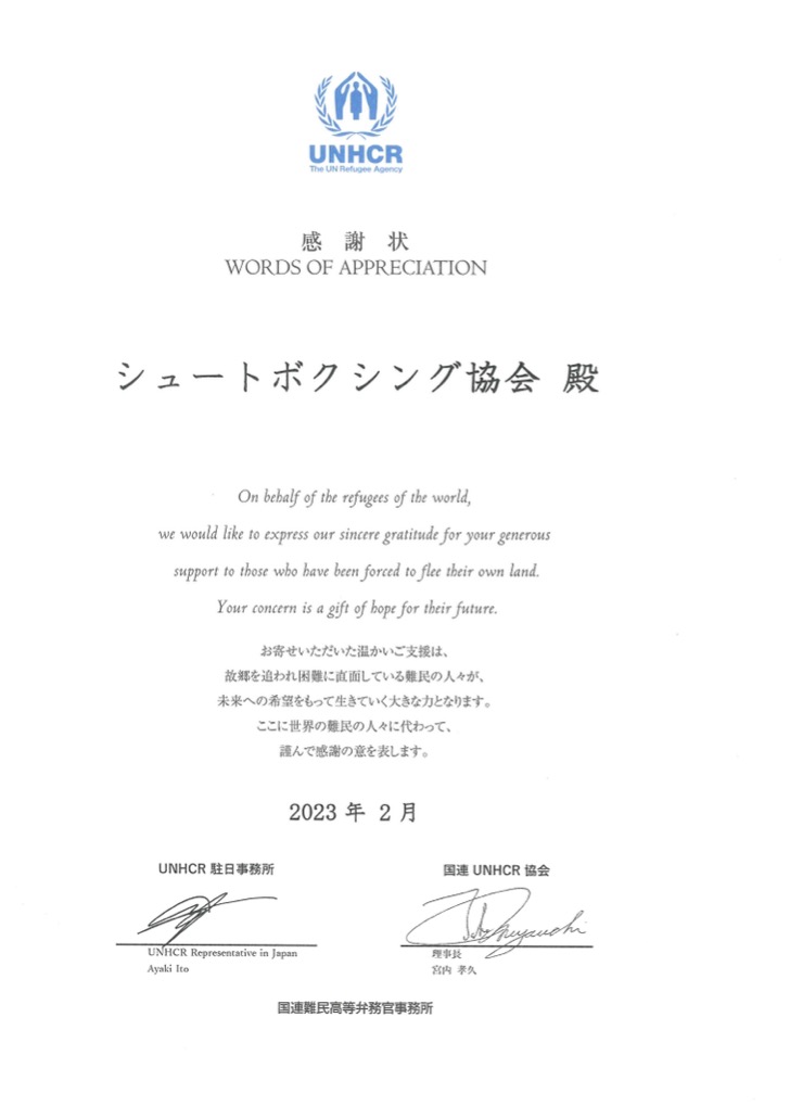 当日集まった募金額合計54,118円と、シュートボクシングを運営する株式会社シーザーインターナショナルからの支援金100,000円を足した総額154,118円を全て【特定非営利活動法人 国連UNHCR協会】に寄付し、国連UNHCR協会とUNHCR駐日事務所より感謝状が届いたことをご報告いたいます。