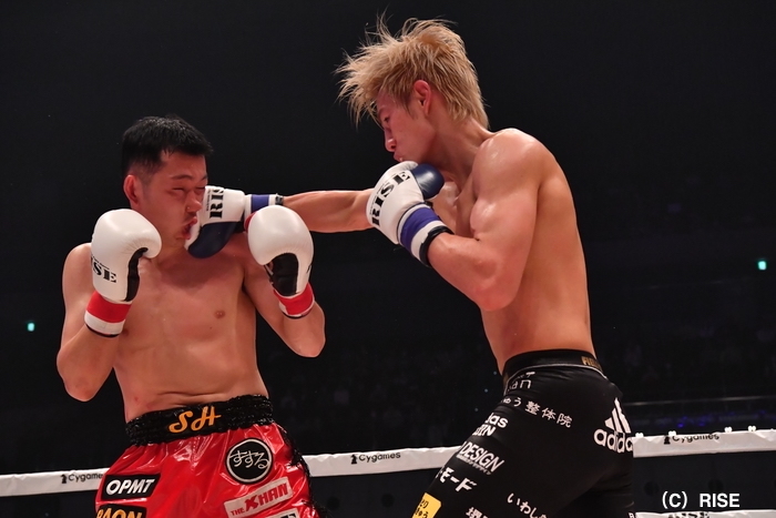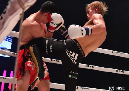 2Rには意地を見せるソンヒョンがパンチの手数で上回ったことでジャッジ三者はイーブン。3Rも近距離での打ち合いが続き、ソンヒョンは手数を出し続けるが4Rには疲れを見せ始めた。海人は右ローとヒザをピンポイントで当て続けると、5Rには海人が連打を浴びせて優勢を印象付ける。タフなソンヒョンを最後まで倒し切れなかったが、海人がフルマークの判定勝ちでRISE王座を獲得した。これで17連勝をマーク。