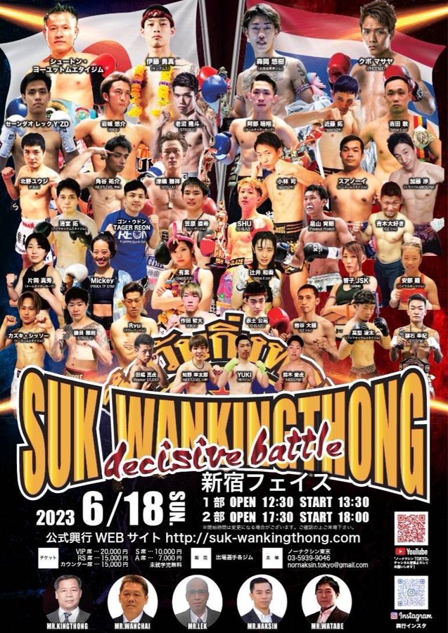 2023年6月18日(日)東京・新宿FACEにて開催される『SUK WAN KINGTHONG(スック・ワンキントーン)decisive battle』に笠原三兄弟の三男・笠原直希(シーザージム)が参戦することが決定した。