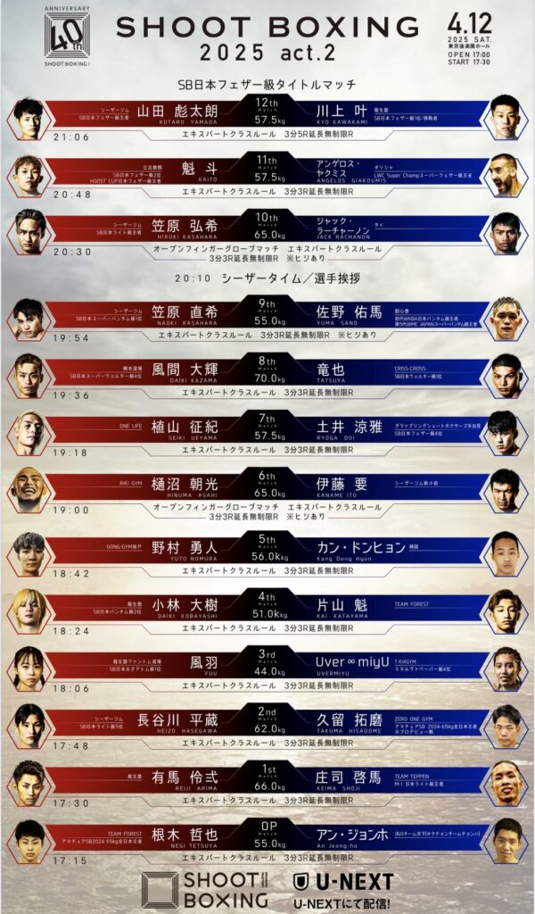 また、全試合順も決定し、SB日本フェザー級王者・山田彪太朗(シーザージム)vs挑戦者・川上叶(龍生塾)のSB日本フェザー級タイトルマッチがメインに、セミはSB日本フェザー級2位・魁斗(立志會館)vs アンゲロス・ヤクミス(ギリシャ)の一戦となった。なお、オープニングファイトに出場する根木哲也(TEAM FOREST)のプロデビュー戦の相手は、18戦6勝12敗の戦績を持つアン・ジョンホ(韓国)に決定した。全試合順は以下の通り。