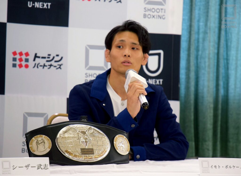 次の試合ではどういう試合を見せたいかと聞かれた両者。笠原は「もちろんKOで倒します。そういう結果を皆さんは望んでいると思うので」といい、イモトは「SBらしい打倒極を全て使った試合をしたいと思います。シーザー武志会長が言われていましたが、元々のSBの形がオープンフィンガーグローブ(以下OFG)でした。笠原君もOFGで結果を残していて、僕もここ数年はOFGでしかやっていないので、笠原君に提案なのですが、OFGでのタイトルマッチはどうですか?」と提案すると、笠原は「全然いい! ヒジありでも何でもいいよ。かかってこいよ」とOFGマッチは望むところだという。