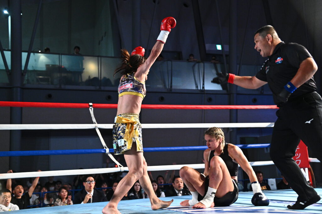 2R、エグの右ミドル、前蹴りをさばいて前進するMISAKIはワンツー、組んでのヒザと手数でペースを握る中、3Rに右ストレートをクリーンヒットさせてダウン奪取!
