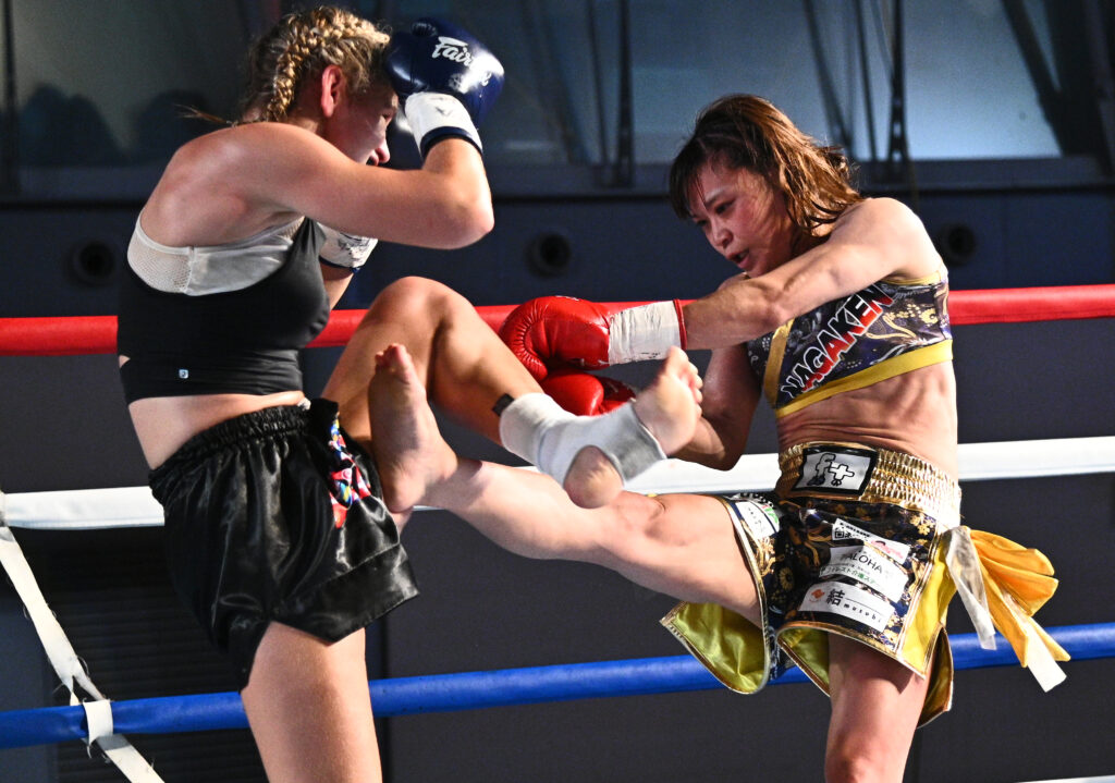 WMCスイス女子ミニフライ級(51kg)王者で、19勝(2KO)7敗の戦績を持つエグに対し、1R、MISAKIは右カーフで削っていき、左フック。掴みからのヒザ蹴りが有効なルールのため、6cmも長身のエグを掴んではMISAKIは積極的にヒザを当てて一歩も譲らない。
