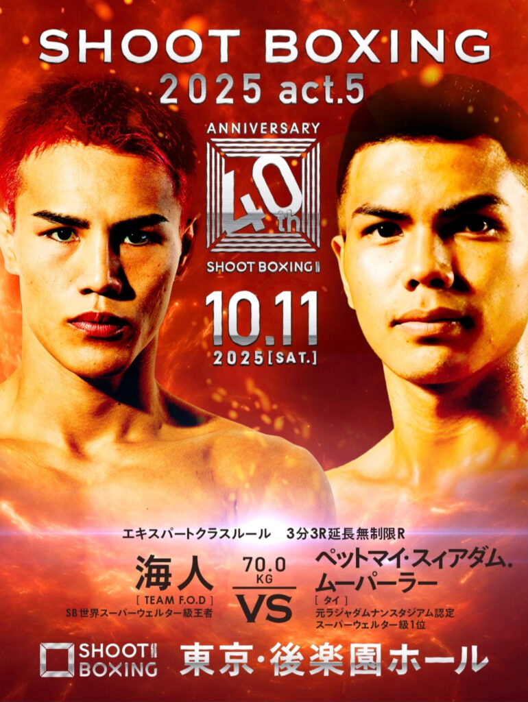 2025年10月11日(土)東京・後楽園ホールで開催される『SHOOT BOXING 2025 act.5』のメインイベントで元ラジャダムナンスタジアム認定スーパーウェルター級1位のペットマイ・スィアダム.ムーパーラー(タイ)と対戦するSB世界スーパーウェルター級王者・海人(TEAM F.O.D)。前回6月のエンリコ・ケール戦で敗れ、キャリア初の二連敗となった海人だが、再び“世界最強”を求めて再出発する。完全復活なるか。