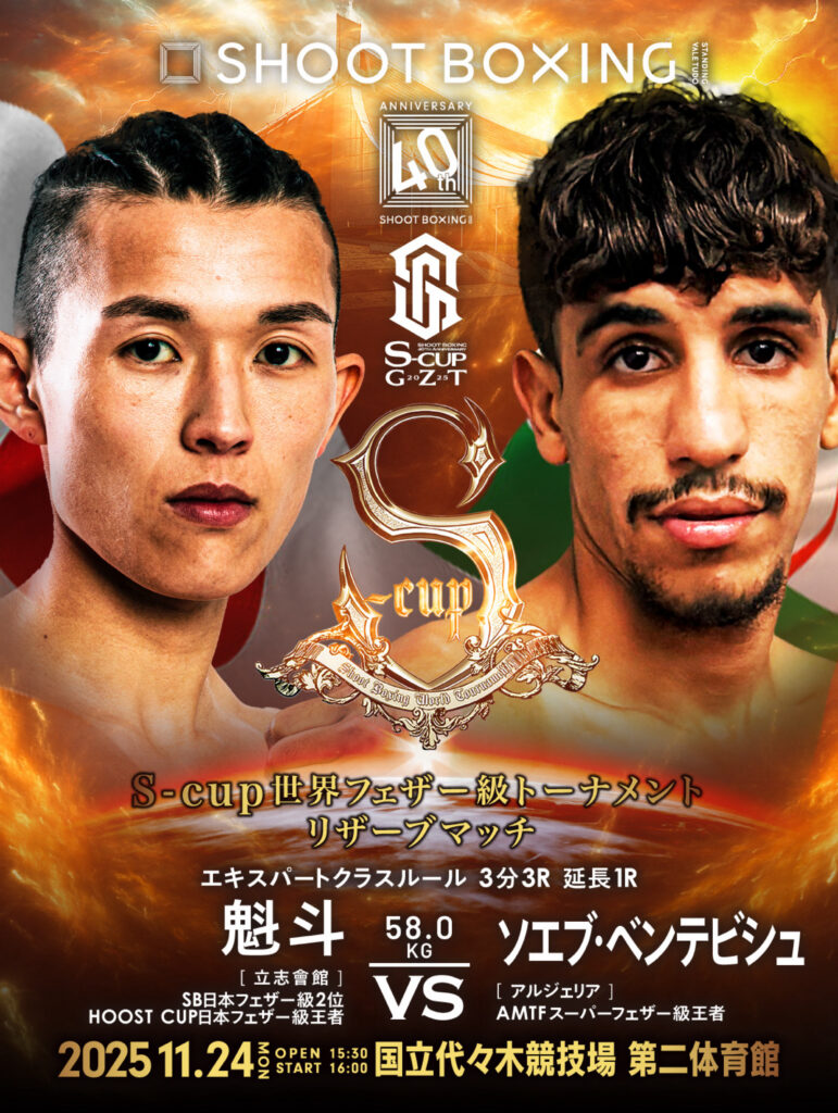 2025年11月24日(月・祝)東京・国立代々木競技場第二体育館にて開催される『~SHOOT BOXING 40th Anniversary~S-cup×GZT 2025』のS-cup世界フェザー級トーナメントのリザーブマッチでソエブ・ベンテビシュ(アルジェリア)と対戦するSB日本フェザー級2位・魁斗(立志會館)。前回6月の山田虎矢太戦でキャリア初のKO負けを喫した“西の天才”は、再起戦で復活アピ―ルなるか。