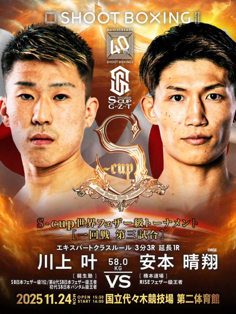 2025年11月24日(月・祝)東京・国立代々木競技場第二体育館にて開催される『~SHOOT BOXING 40th Anniversary~S-cup×GZT 2025』のS-cup世界フェザー級トーナメント一回戦でRISEフェザー級王者・安本晴翔(橋本道場)と対戦する川上叶(龍生塾)。2022年12月に勝利している安本を返り討ちにし、決勝戦で山田彪太朗へのリベンジ&優勝を果たすか。