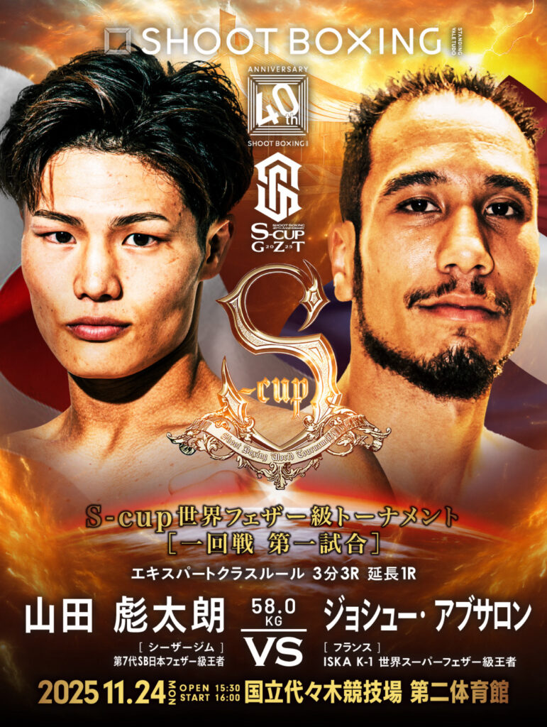 2025年11月24日(月・祝)東京・国立代々木競技場第二体育館にて開催される『~SHOOT BOXING 40th Anniversary~S-cup×GZT 2025』のS-cup世界フェザー級トーナメント一回戦でSB日本フェザー級王者・山田彪太朗(シーザージム)と対戦するISKA K-1ルール世界スーパーフェザー級王者ジョシュー・アブサロン(フランス)が来日、22日(土)都内にて公開練習を行った。