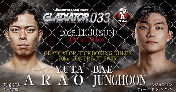 2025年11月30日(日)大阪・176BOXで開催される『GLADIATOR 033』に、SB日本スーパーウェルター級5位・荒尾祐太(チーム吉鷹)が出場することが決定した。