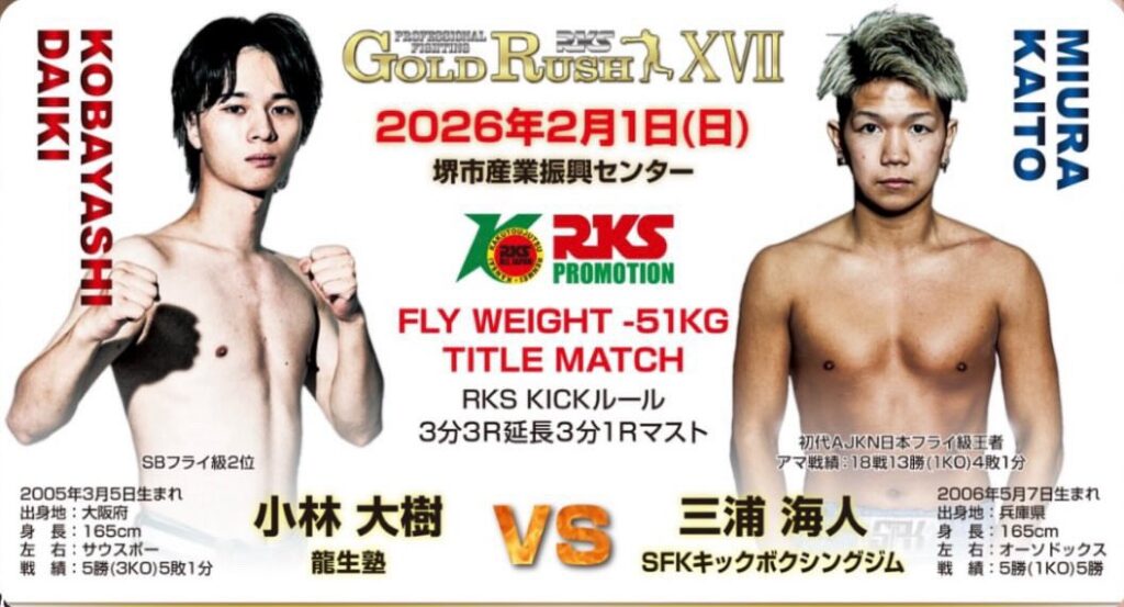 2026年2月1日(日)大阪・堺市産業振興センターにて開催される『RKS GOLD RUSH XVII』にSB日本フライ級2位・小林大樹(龍生塾)が参戦、RKSフライ級(-51kg)タイトルマッチに挑戦することが発表された。