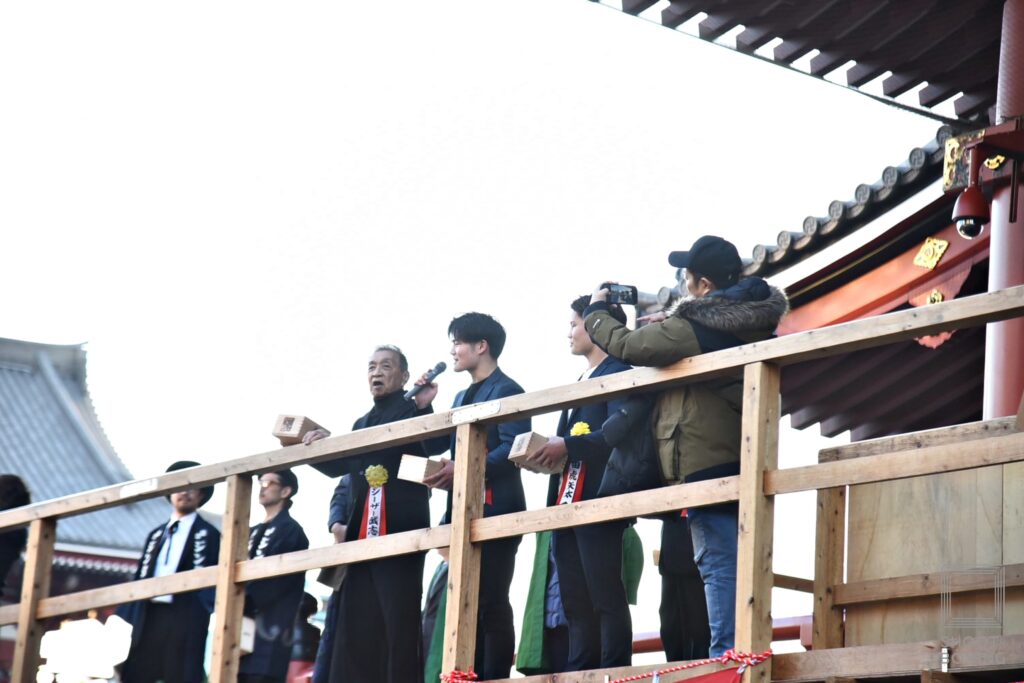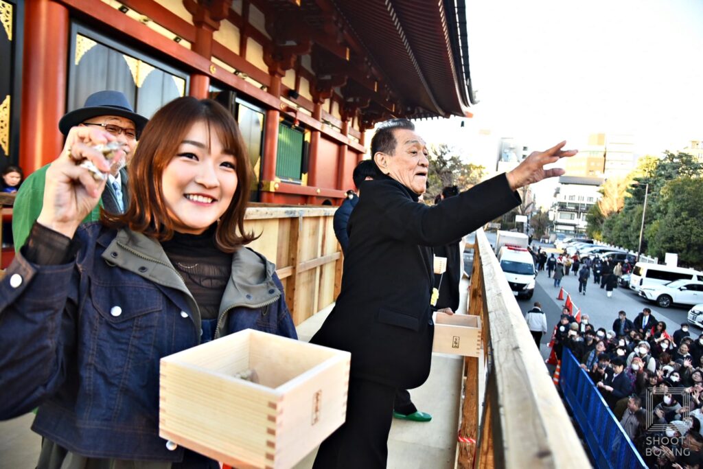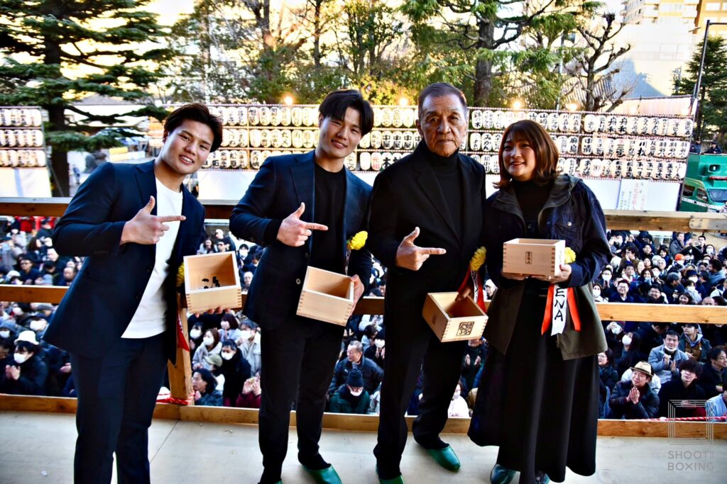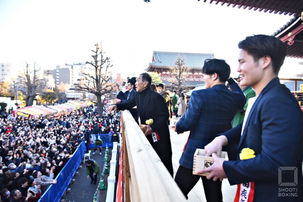 そして、彪太朗は「浅草で生まれ育ち、先月23歳になりました。今まで浅草から元気をもらった分、これからは逆に僕が浅草に元気を与えられるように精一杯頑張っていきます。僕たちは出ないのですが、1週間後の14日に後楽園ホールでシュートボクシングの興行がありますので皆さんぜひ会場に来てください。U-NEXTでも観られるので見てください」、虎矢太は「生まれ育ったこの浅草で豆まきをすることができて嬉しく思います。今年1年は皆さんに元気を届けられるような試合をお見せしますので、応援よろしくお願いします」とそれぞれが笑顔であいさつした。