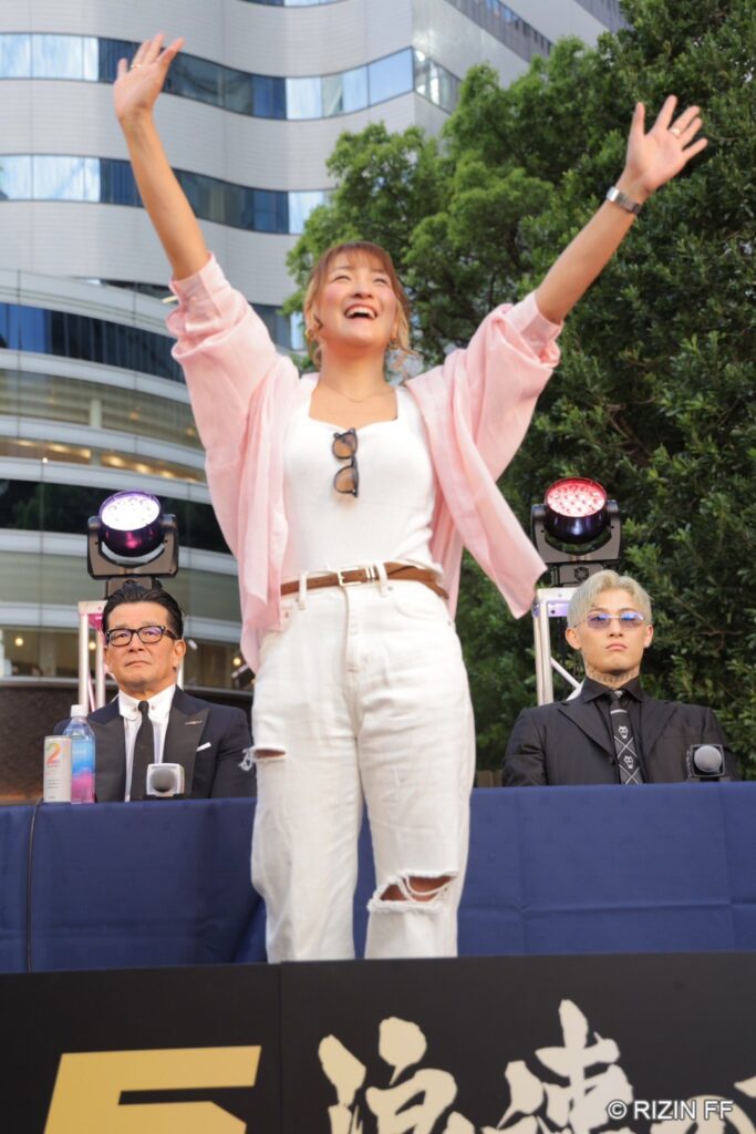 出場決定選手として登場したSB世界女子フライ級王者・RENA(シーザージム)は「女子のベルトが空位になったということで、ここで一発、地元・大阪で大暴れして、また年末にタイトルマッチにつなげられるような試合をしたいと思うので応援よろしくお願いします」と伊澤星花が返上したRIZIN女子スーパーアトム級タイトル戦線につながる試合をしたいとアピール。