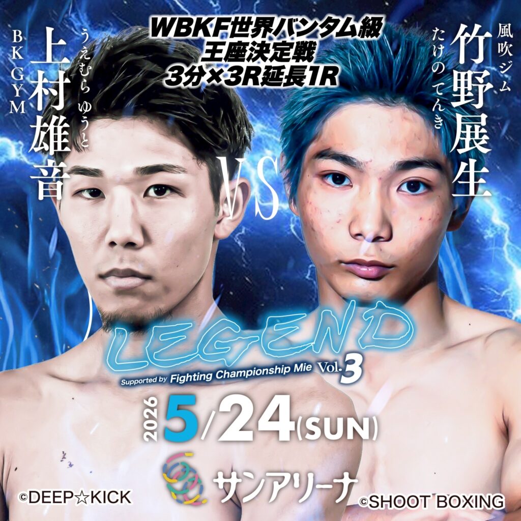 2026年5月24日(日)三重県営サンアリーナ・サブアリーナで開催される『LEGEND vol.3』にSB日本バンタム級3位・竹野展生(風吹ジム)が参戦することが決定した。