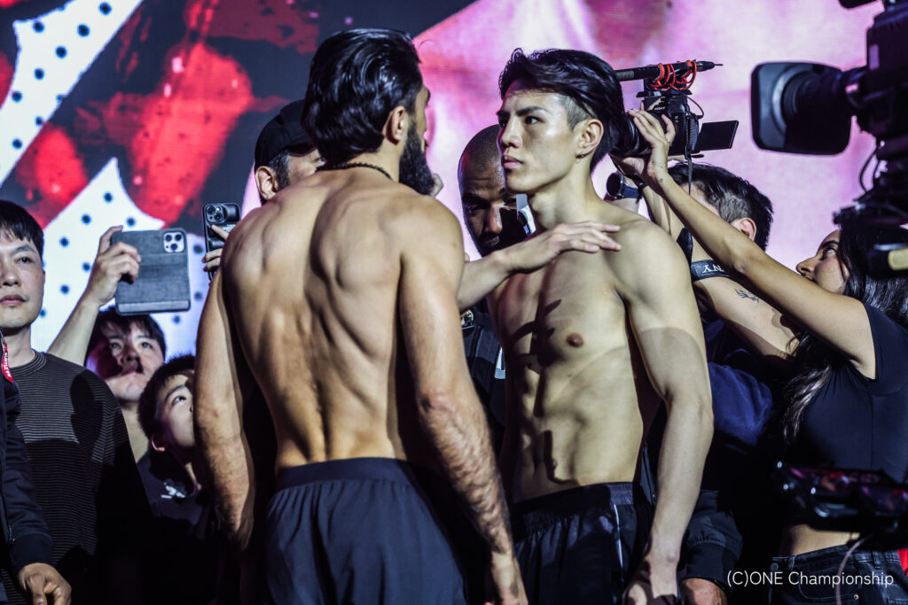 グレゴリアンも69.22kg/1.0023でクリアーし、あとは試合のゴングを待つのみとなった。その後、有明アリーナで17:30から行われた前日公開計量&フェイスオフイベントでは海人とグレゴリアンは激しく睨み合い、チャトリCEOが無理に割って入り、両者を離すこととなった。