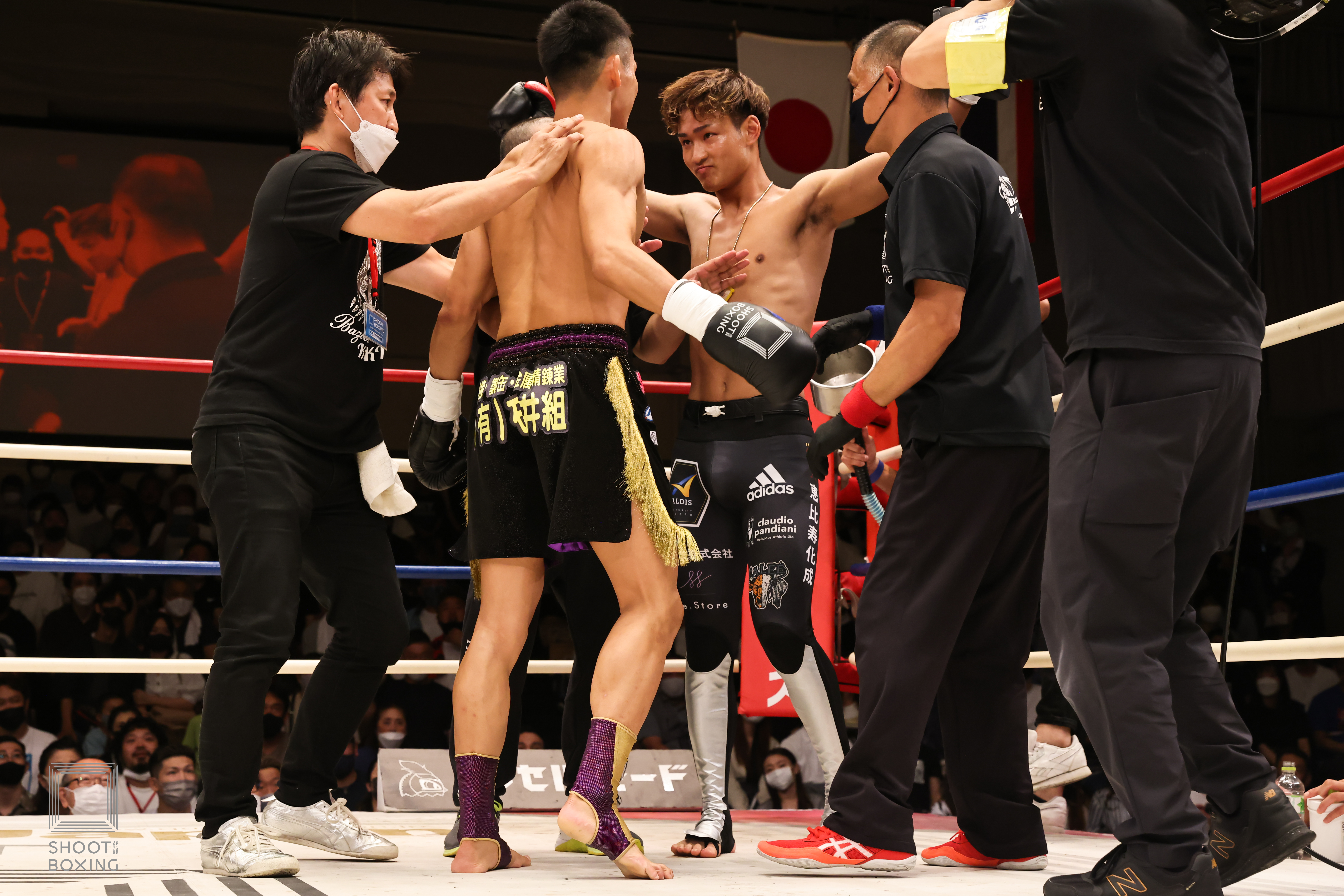K-1グループからTEAM F.O.Dに移籍し、SB初参戦の蒼士を山田ツインズ兄が迎え撃った一戦。1R、山田が上下にパンチを散らして投げ狙い。蒼士もローを返していくが、2Rには左フックを被弾。3Rは打ち合いの中で山田がヒット数で若干、上回ったか。僅差の判定で山田が勝利した。