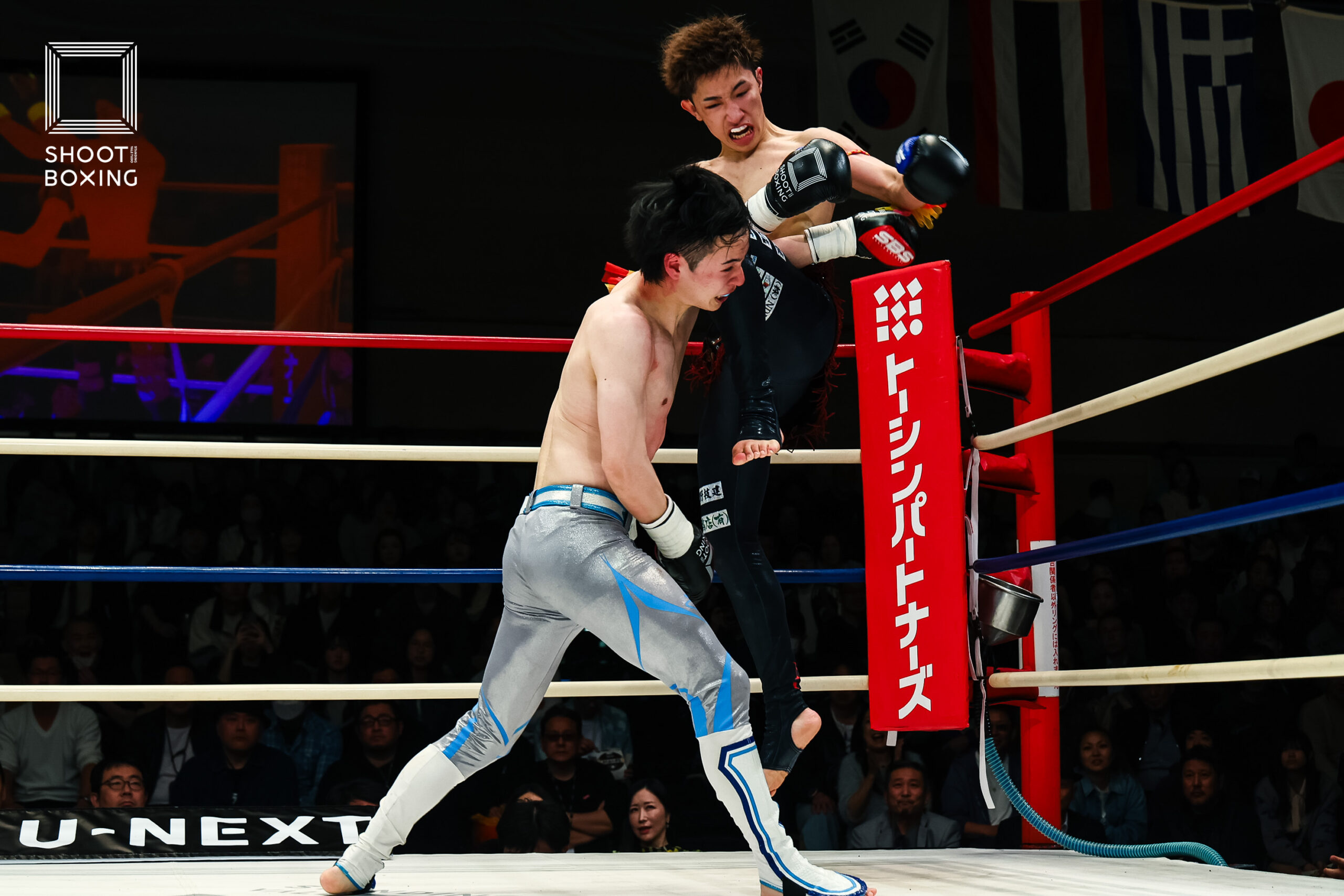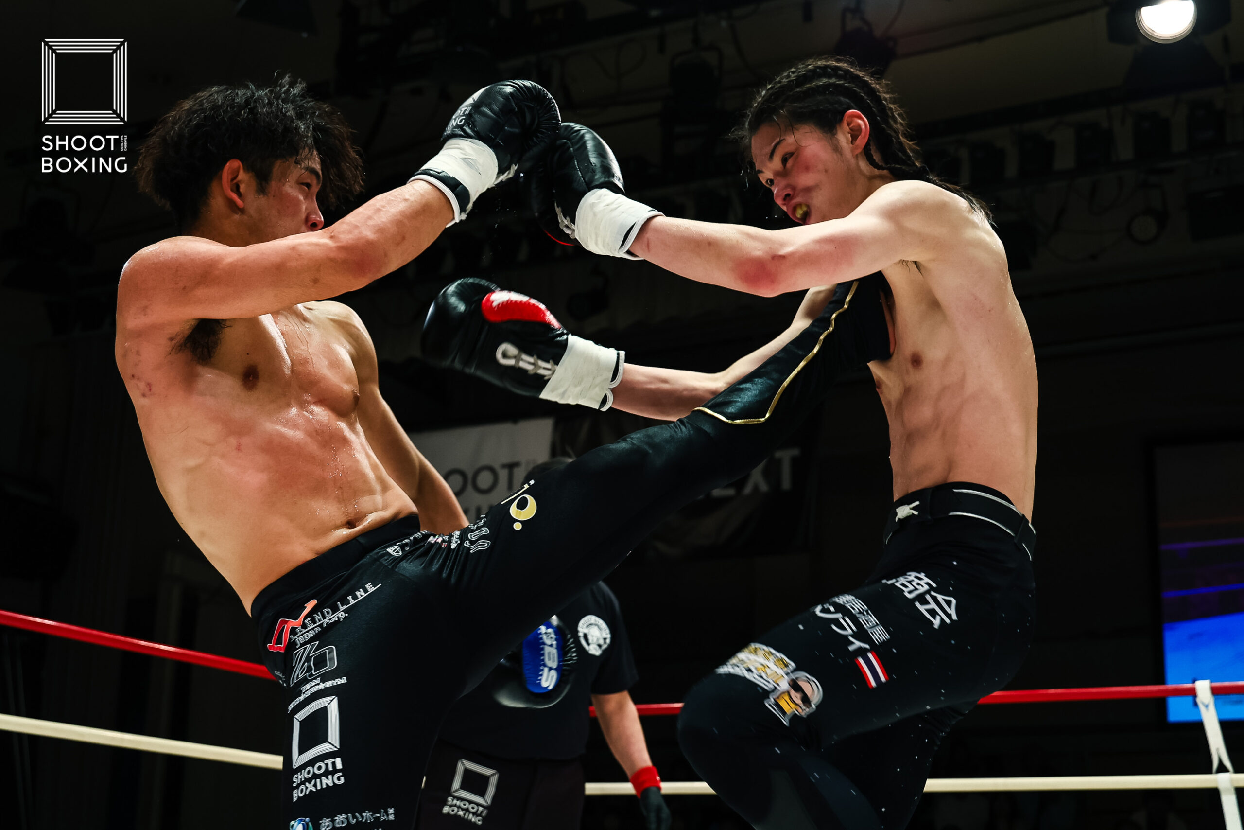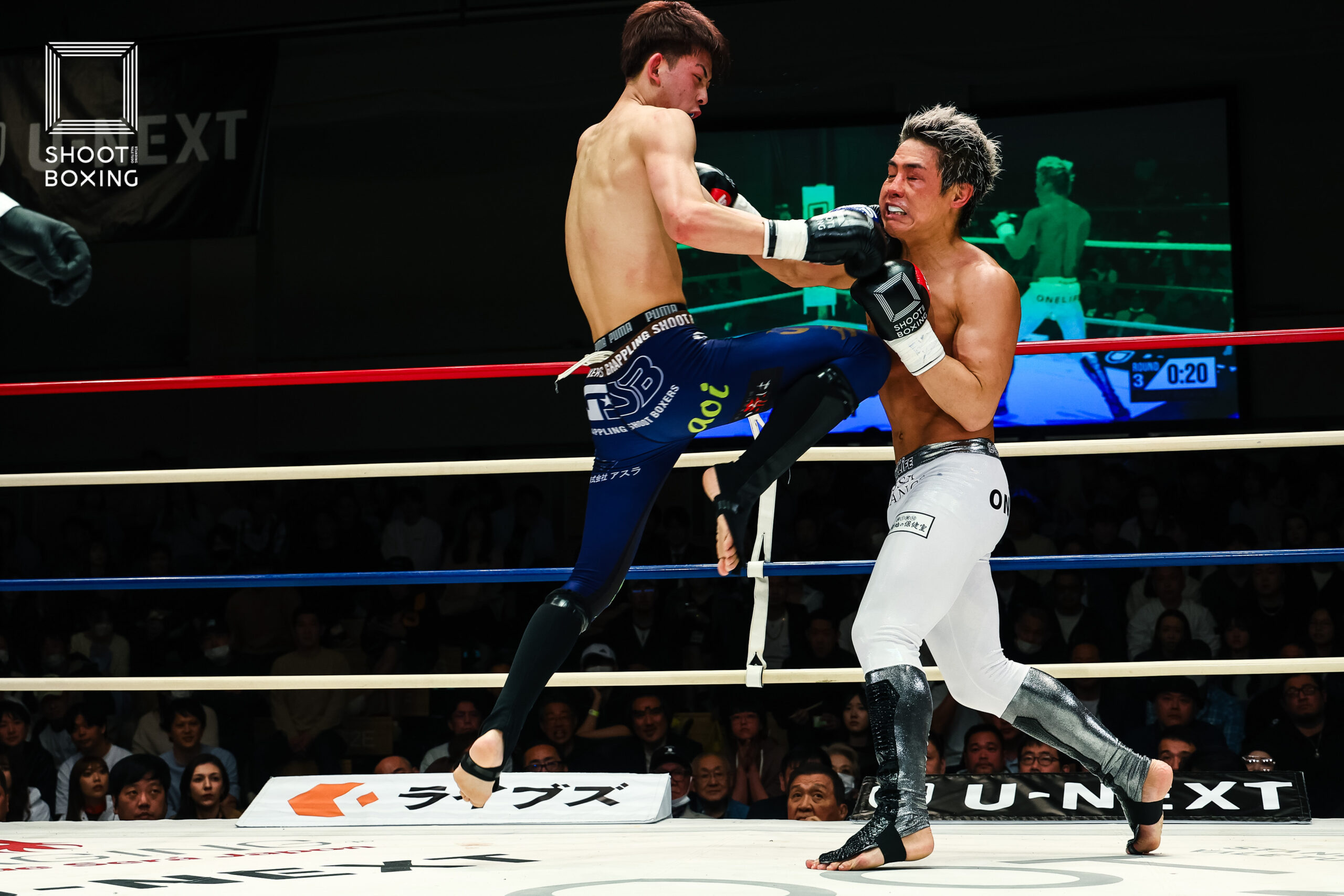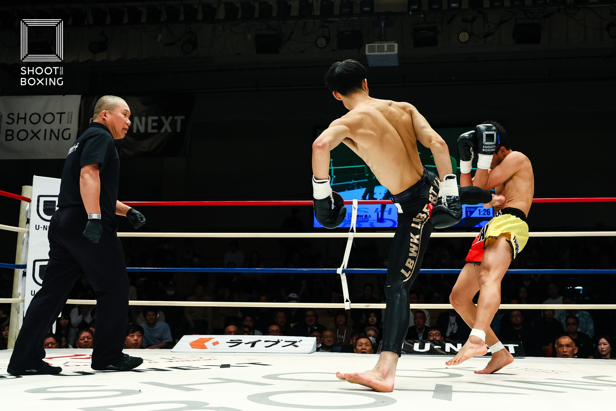 2R、右ローのヤクミスに、魁斗は手数を落とすことなく攻め、右カーフもからめて左ヒザもヒット。このラウンドも魁斗が取った。