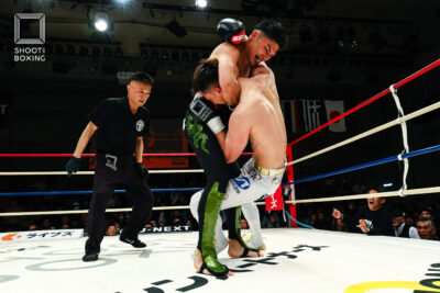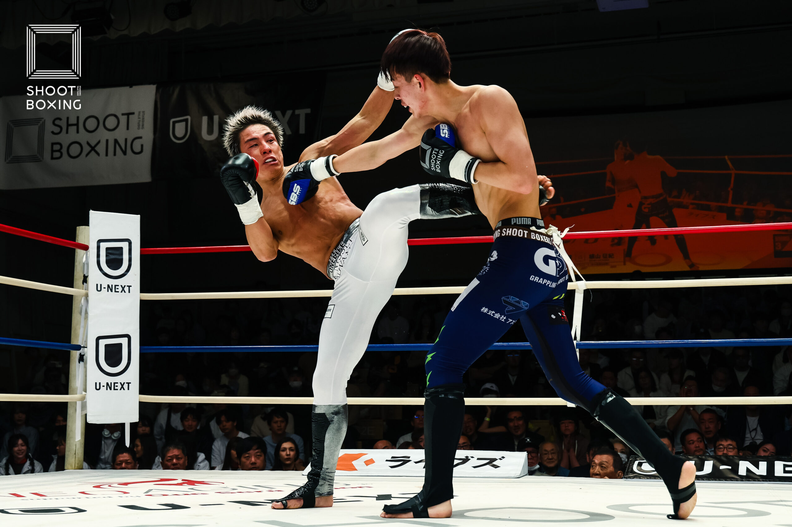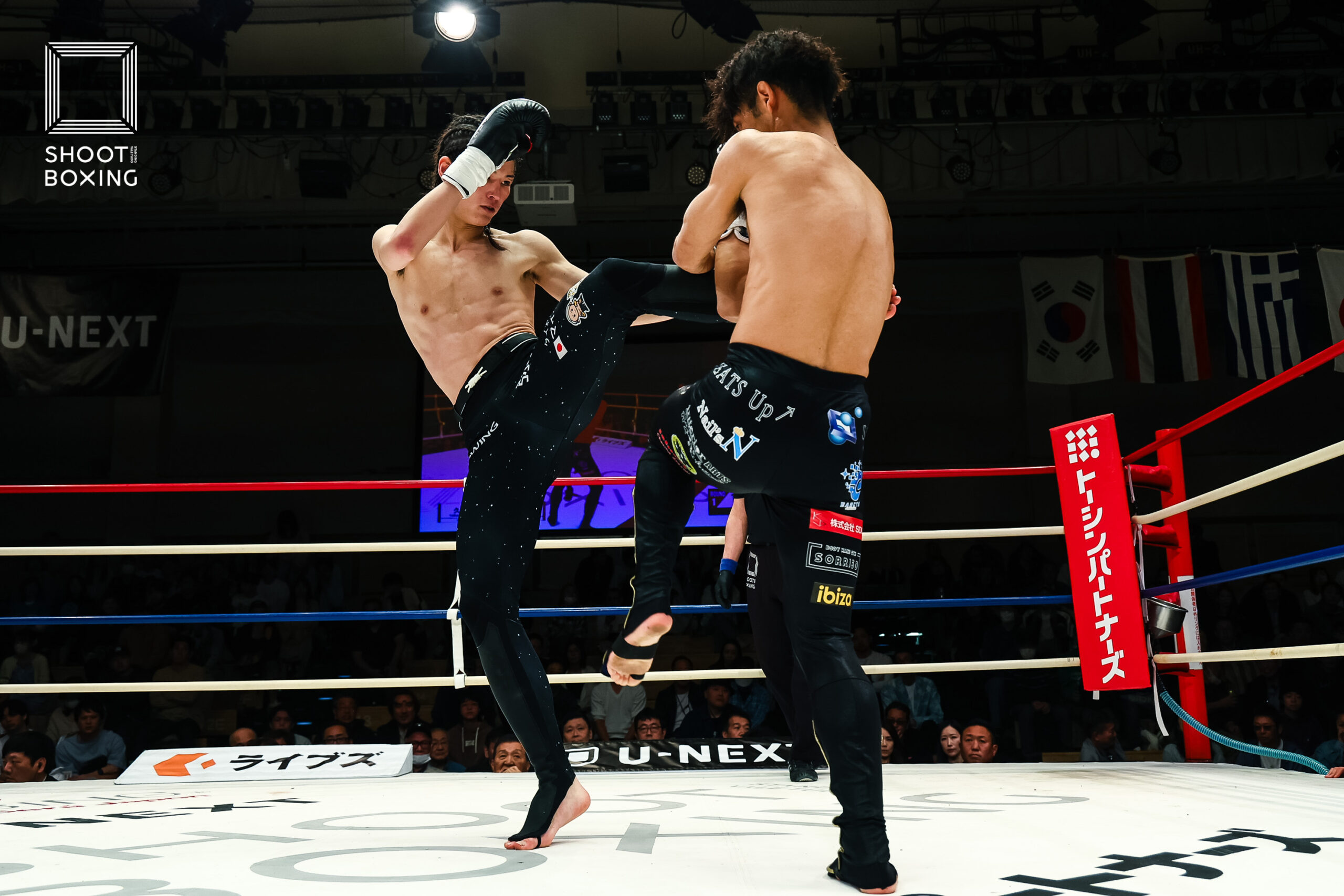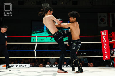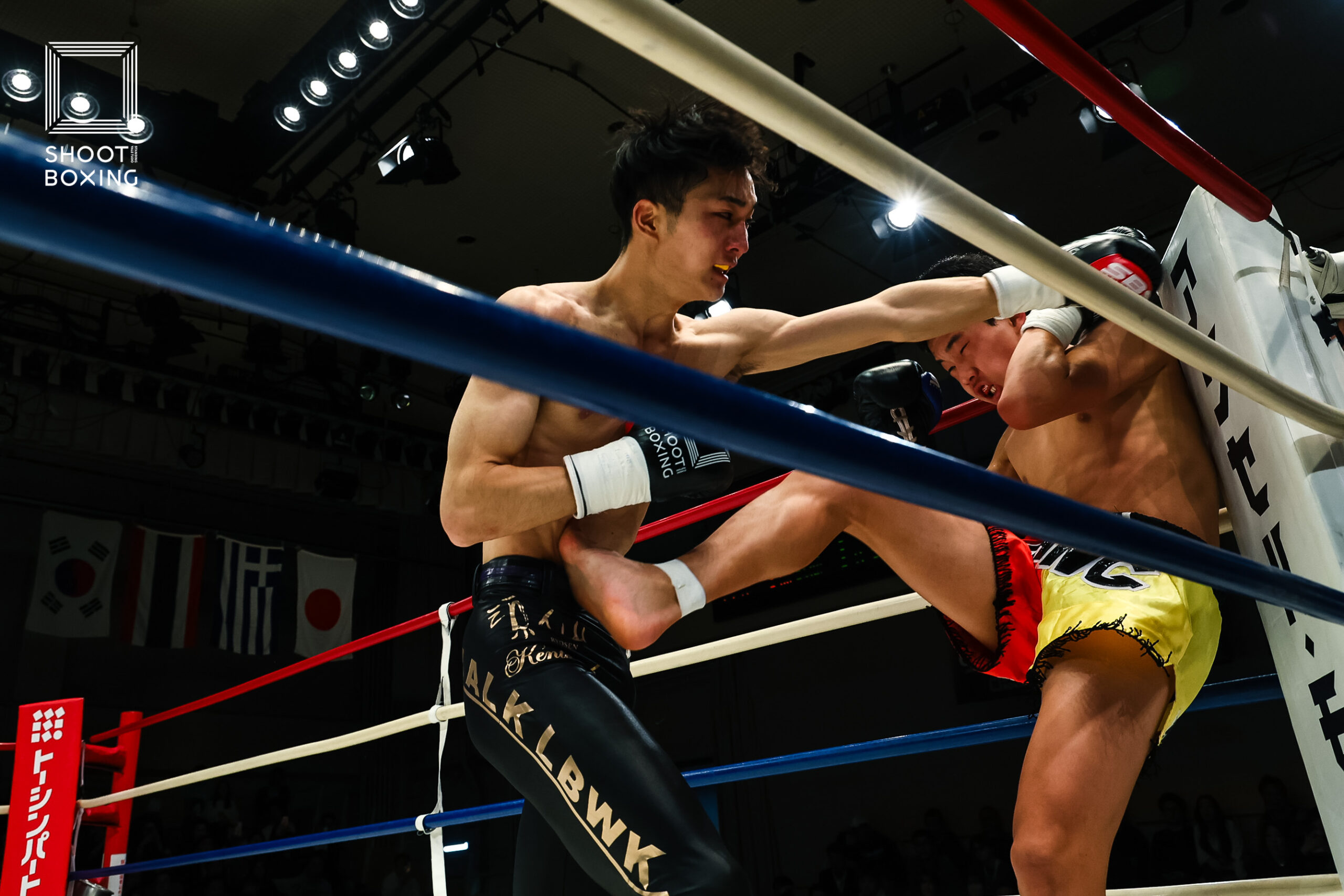 2R、右ローのヤクミスに、魁斗は手数を落とすことなく攻め、右カーフもからめて左ヒザもヒット。このラウンドも魁斗が取った。