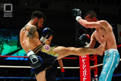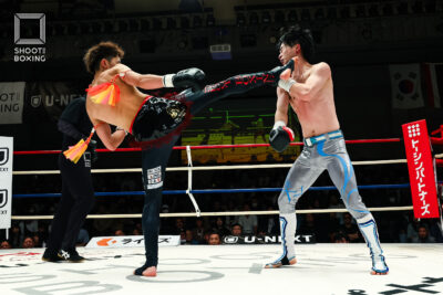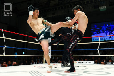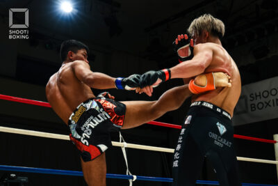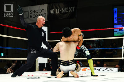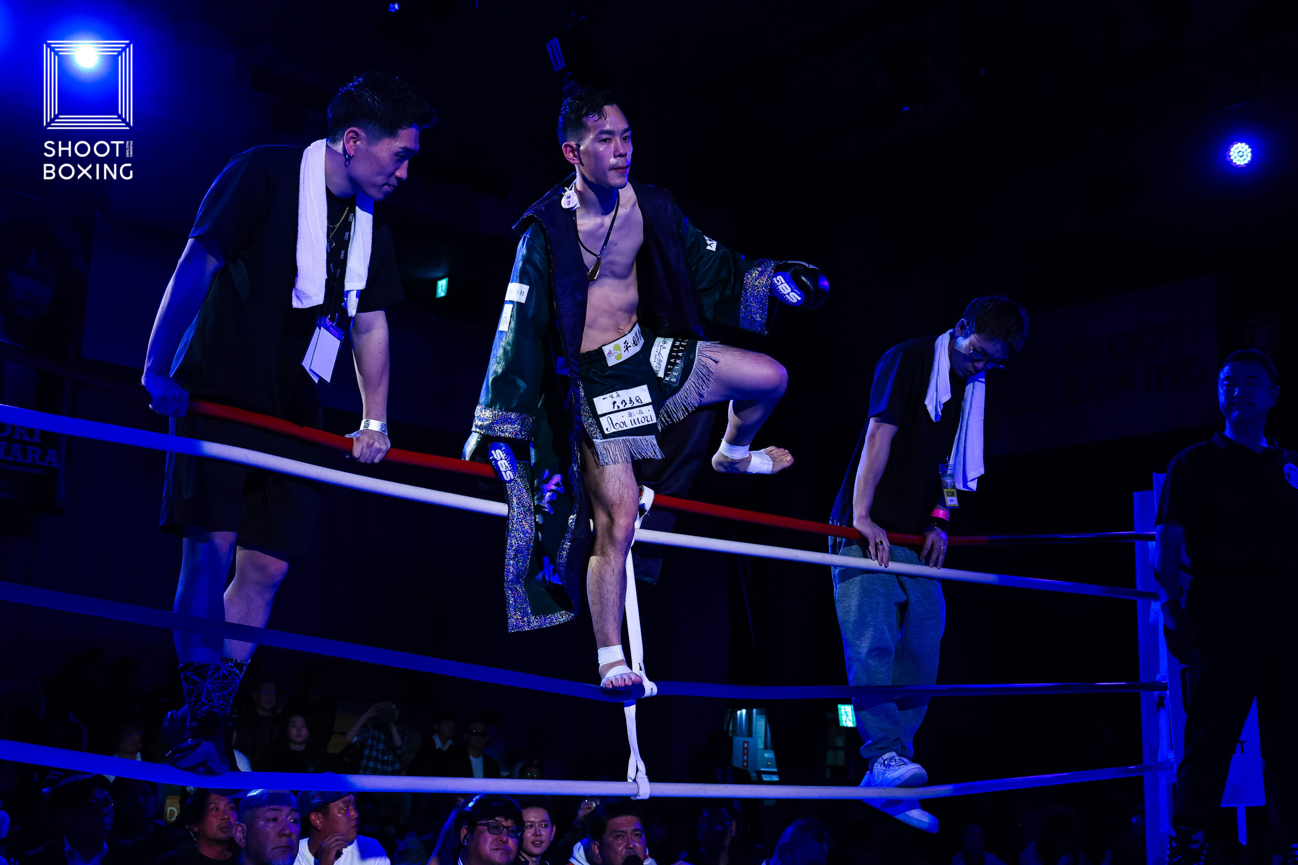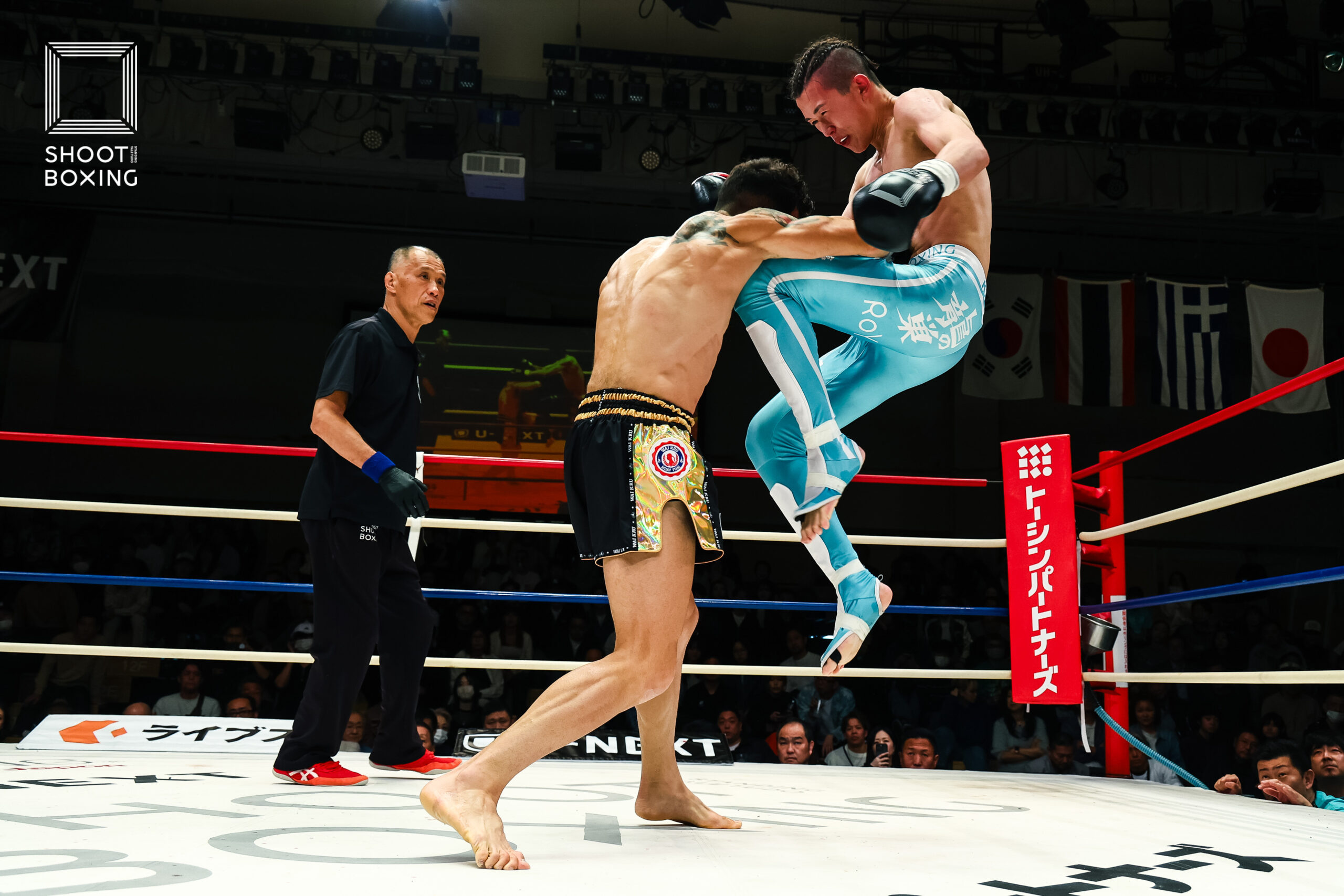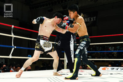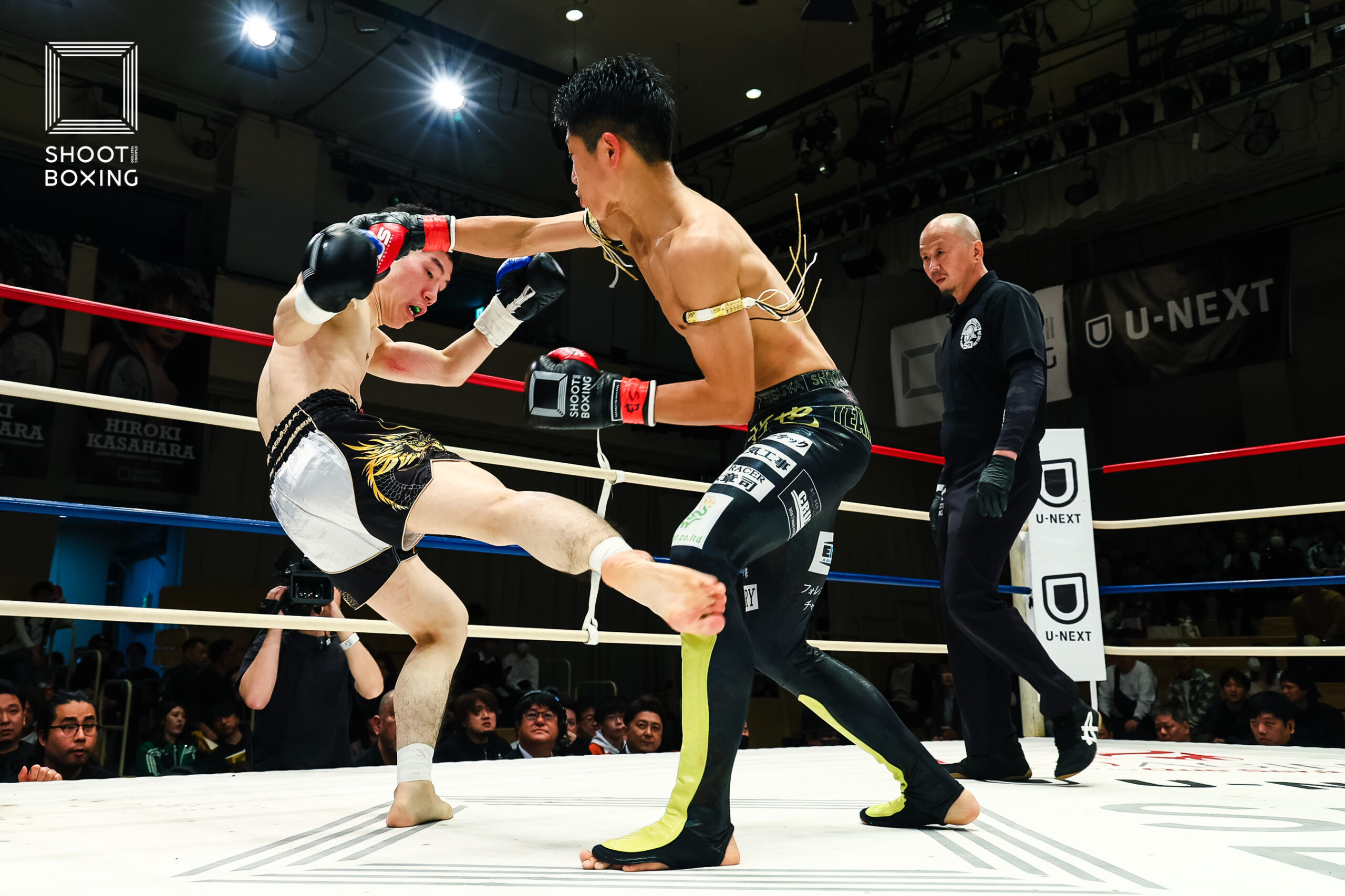 2R、右ローのヤクミスに、魁斗は手数を落とすことなく攻め、右カーフもからめて左ヒザもヒット。このラウンドも魁斗が取った。