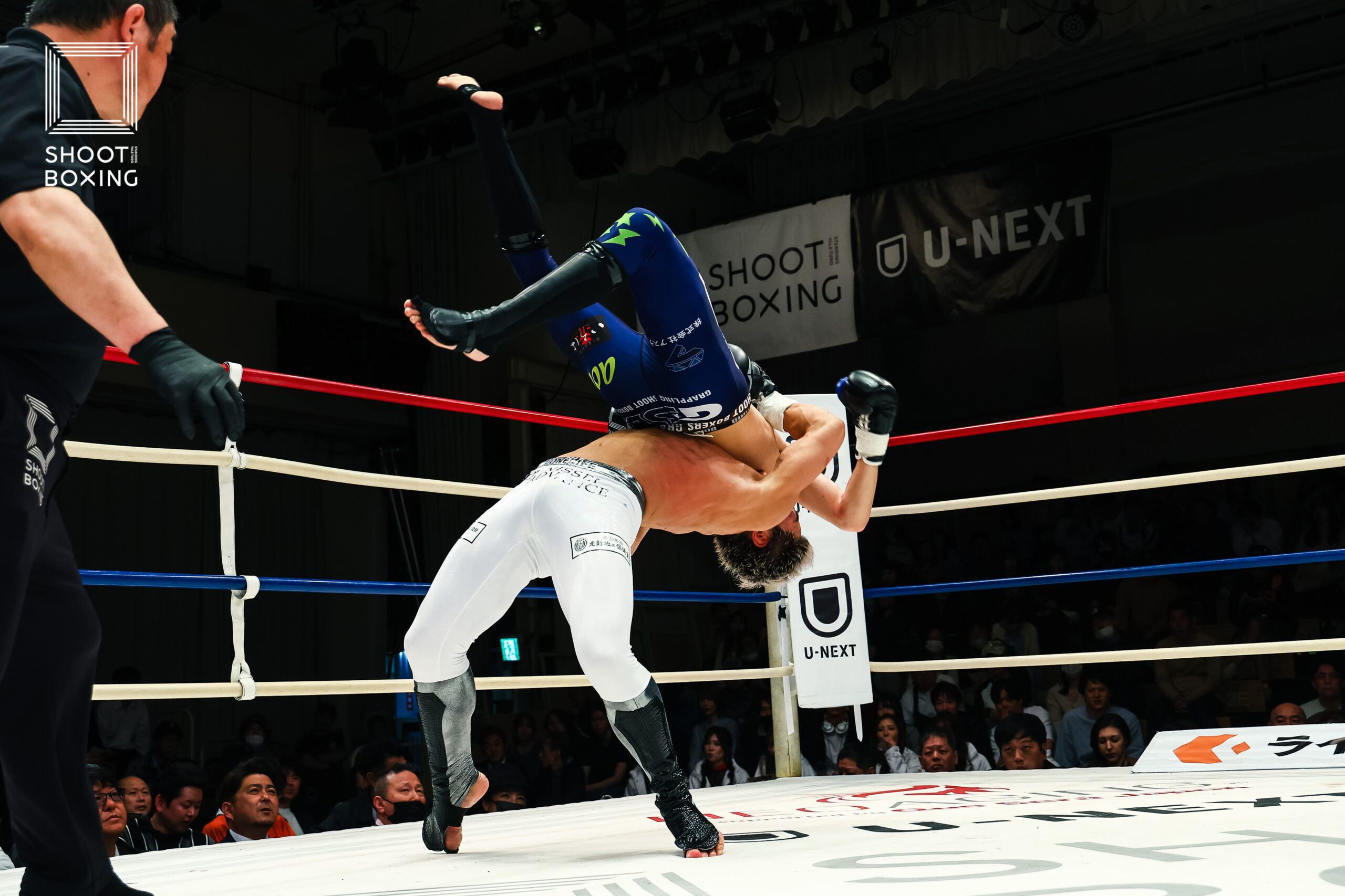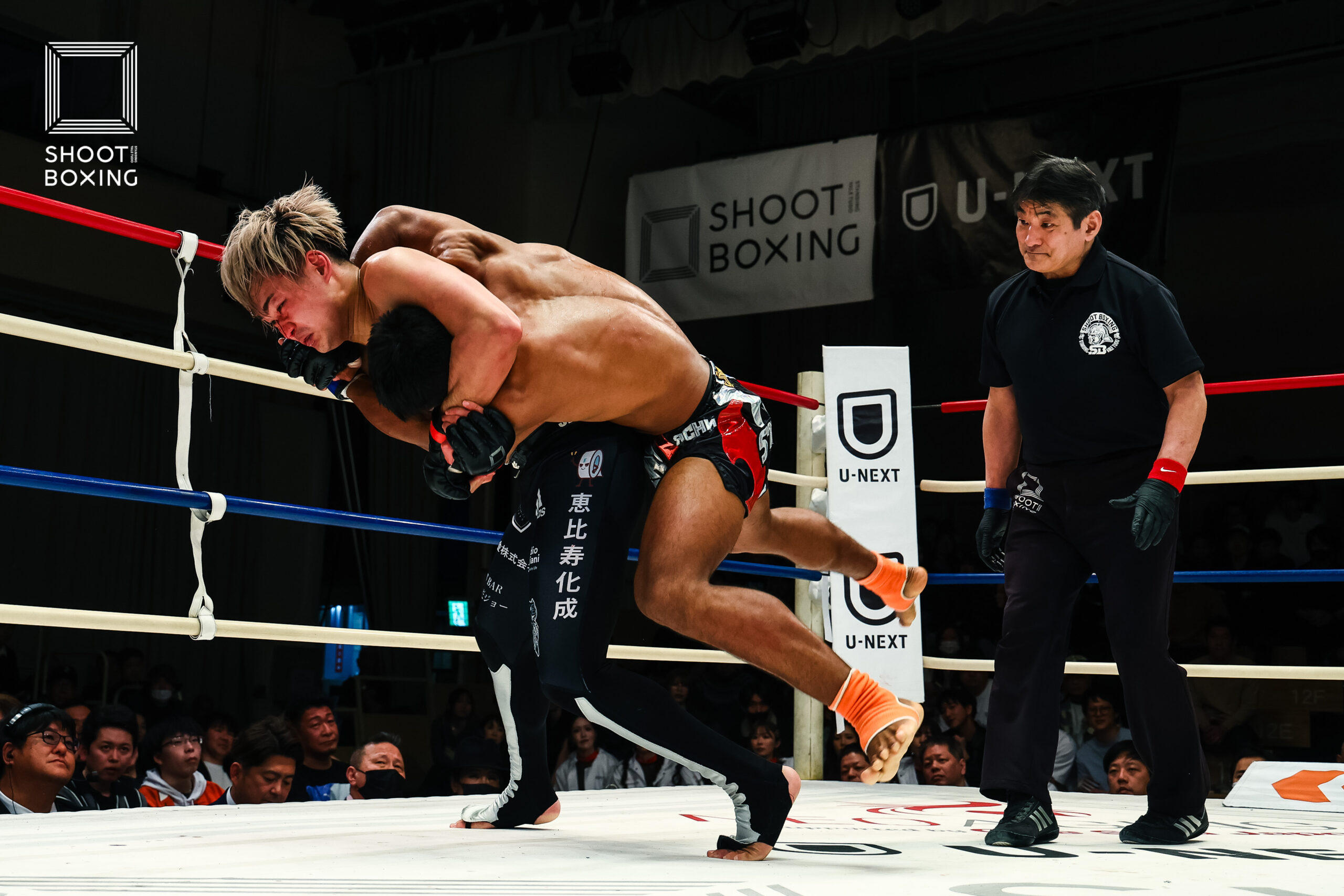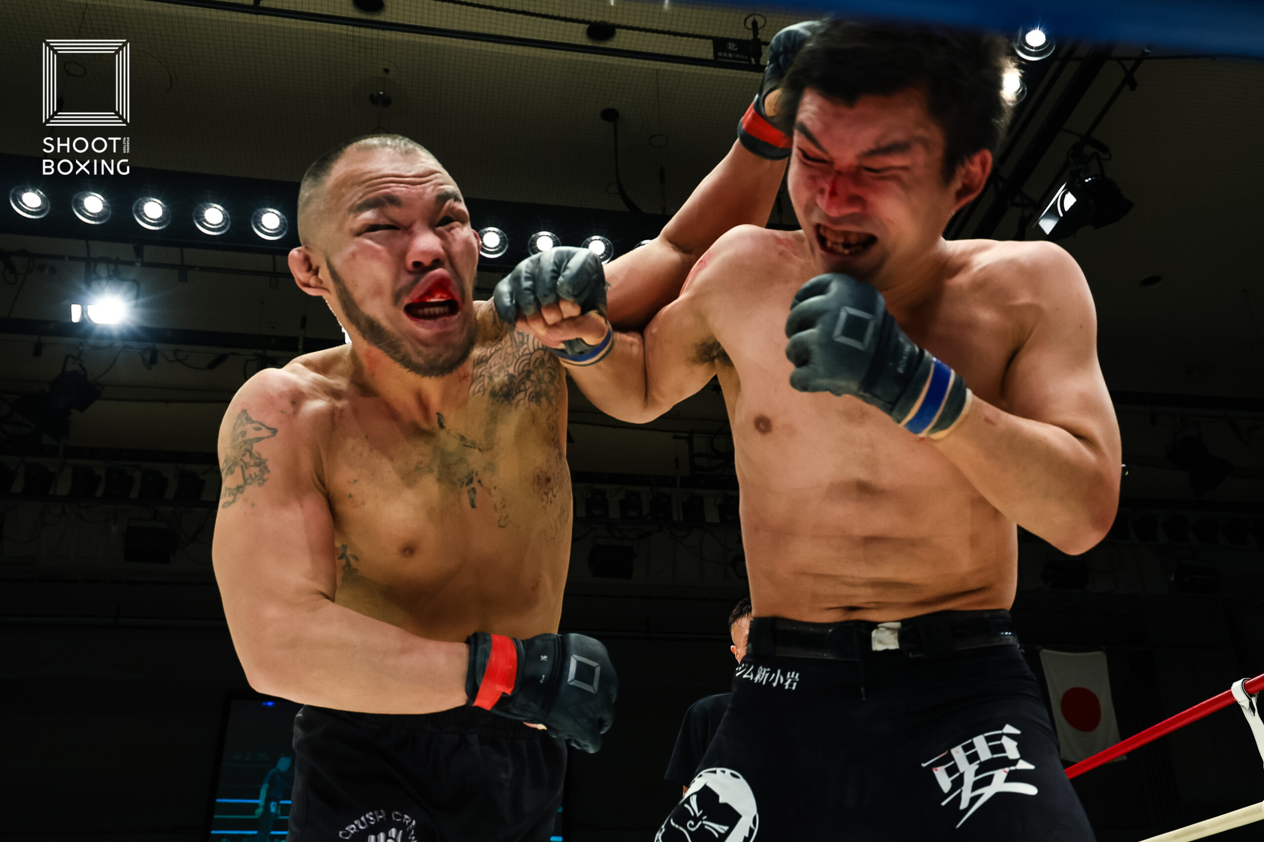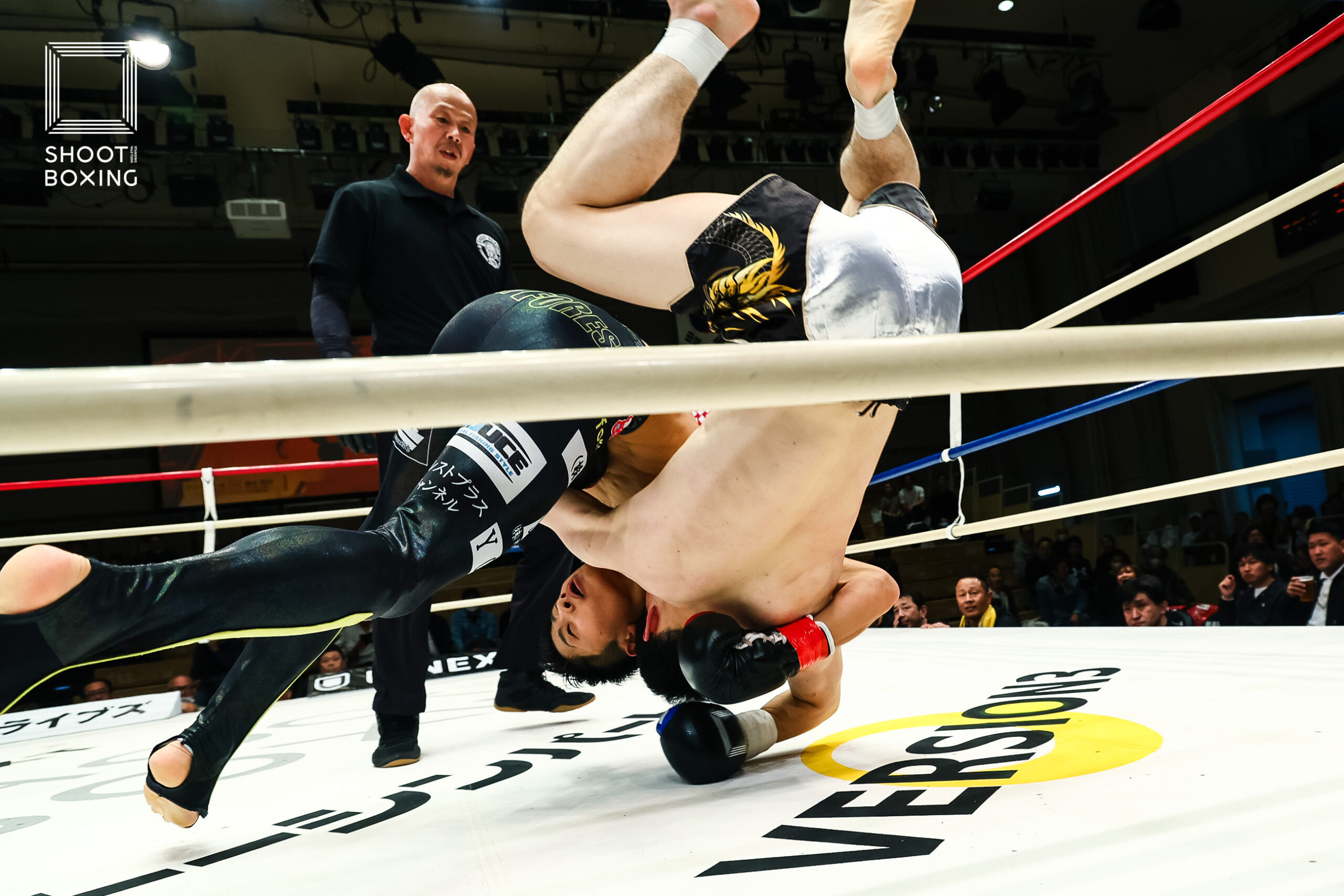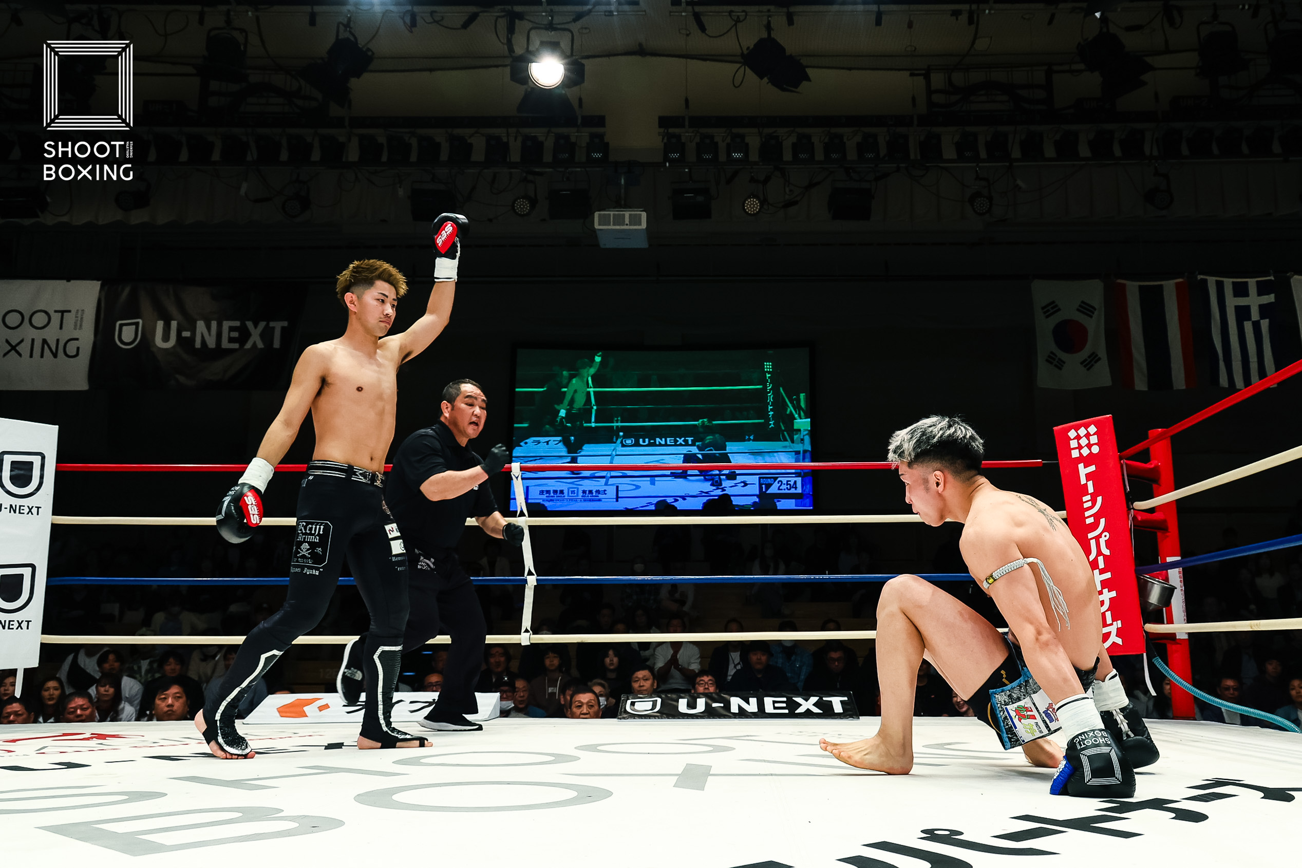 1Rから激しい打撃戦の中、風間が右ストレートでダウン奪取。2Rには、竜也が右ストレートでダウンを奪い返したが、風間も右ストレートで2度目のダウンを奪う。3R、竜也は足をキャッチして持ち上げると、珍しい形で強引にサイドに叩き落してシュートポイントを奪う。さらに立った状態でフロントチョークも極めてシュートポイントも獲得したが、そこで力を使い切ったか、失速。余力のある風間は首投げでシュートポイントを奪って大差を付けて判定勝ち。まさにSBを体現する激闘で会場からは拍手が起こった。