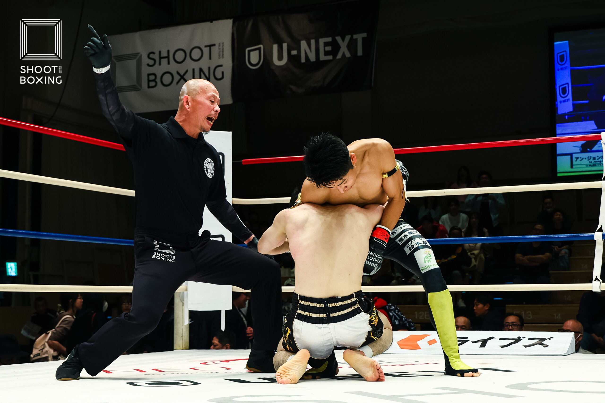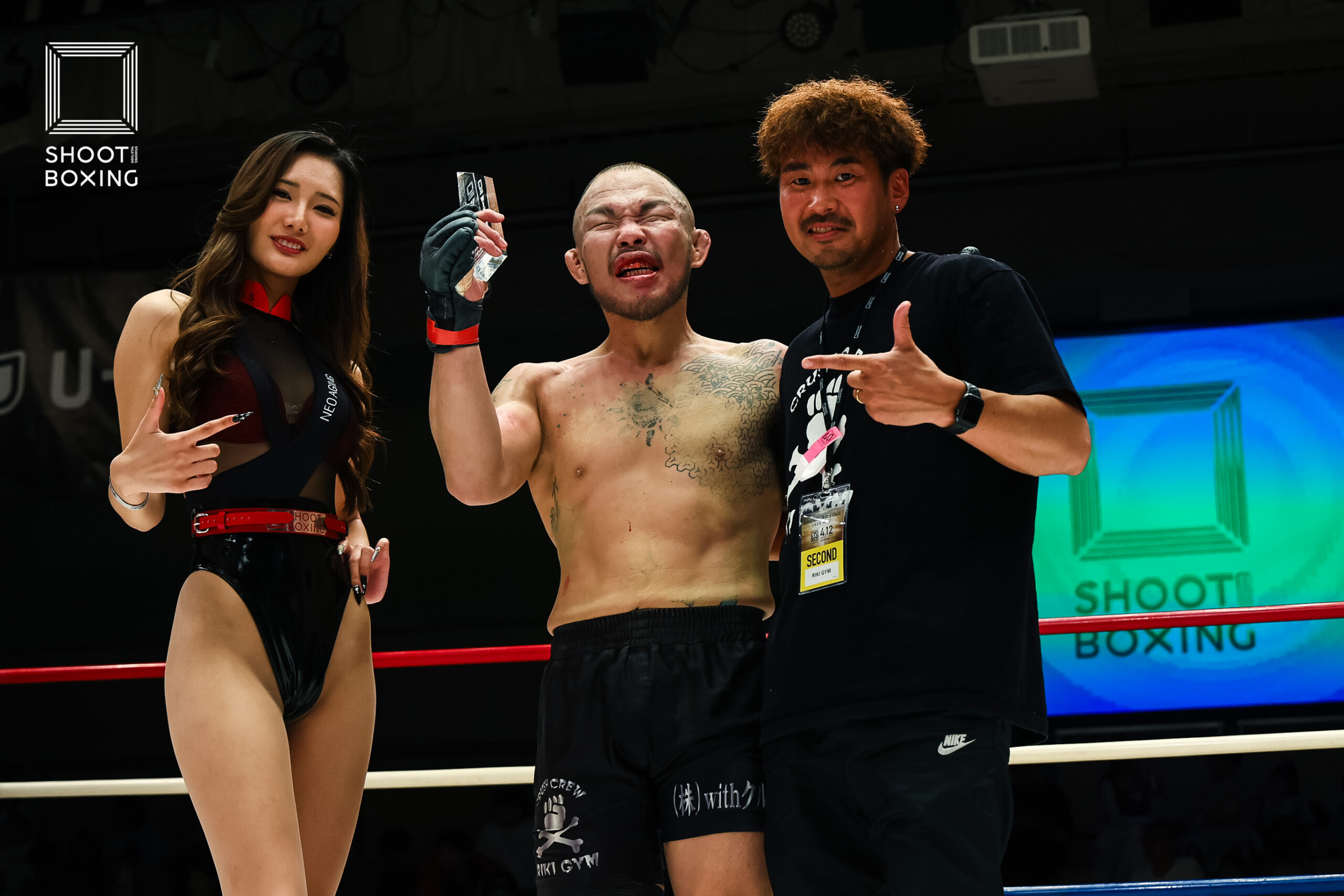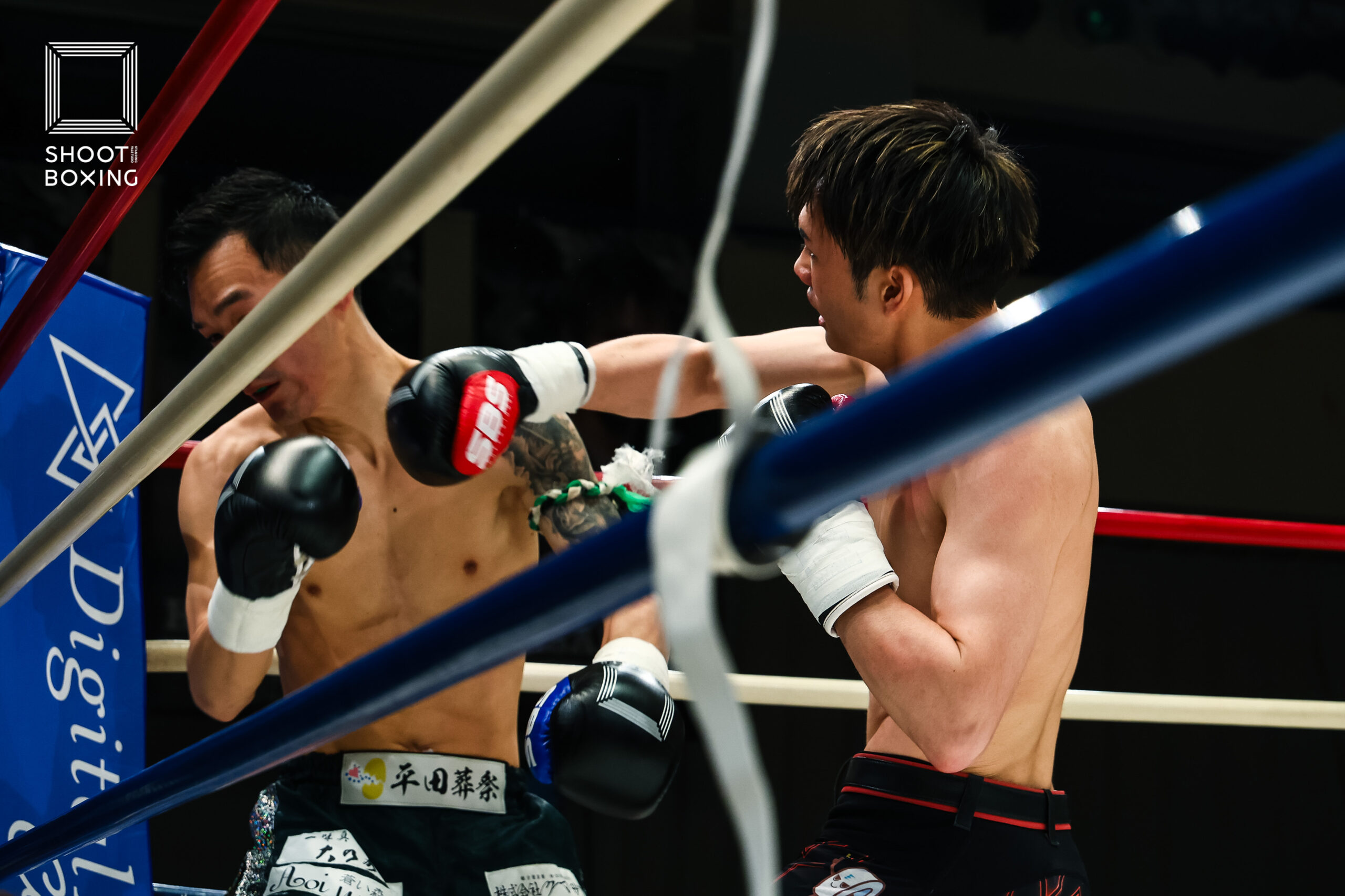 1Rから左右のローを当てる植山に対し、土井も右ストレートを当てて一歩も退かない。2R、左ストレートを当てる植山がペースを握ると、3Rにはバックドロップでシュートポイント奪取。土井はパンチで反撃するも、植山が危なげなく判定勝ちで復活をアピールした。