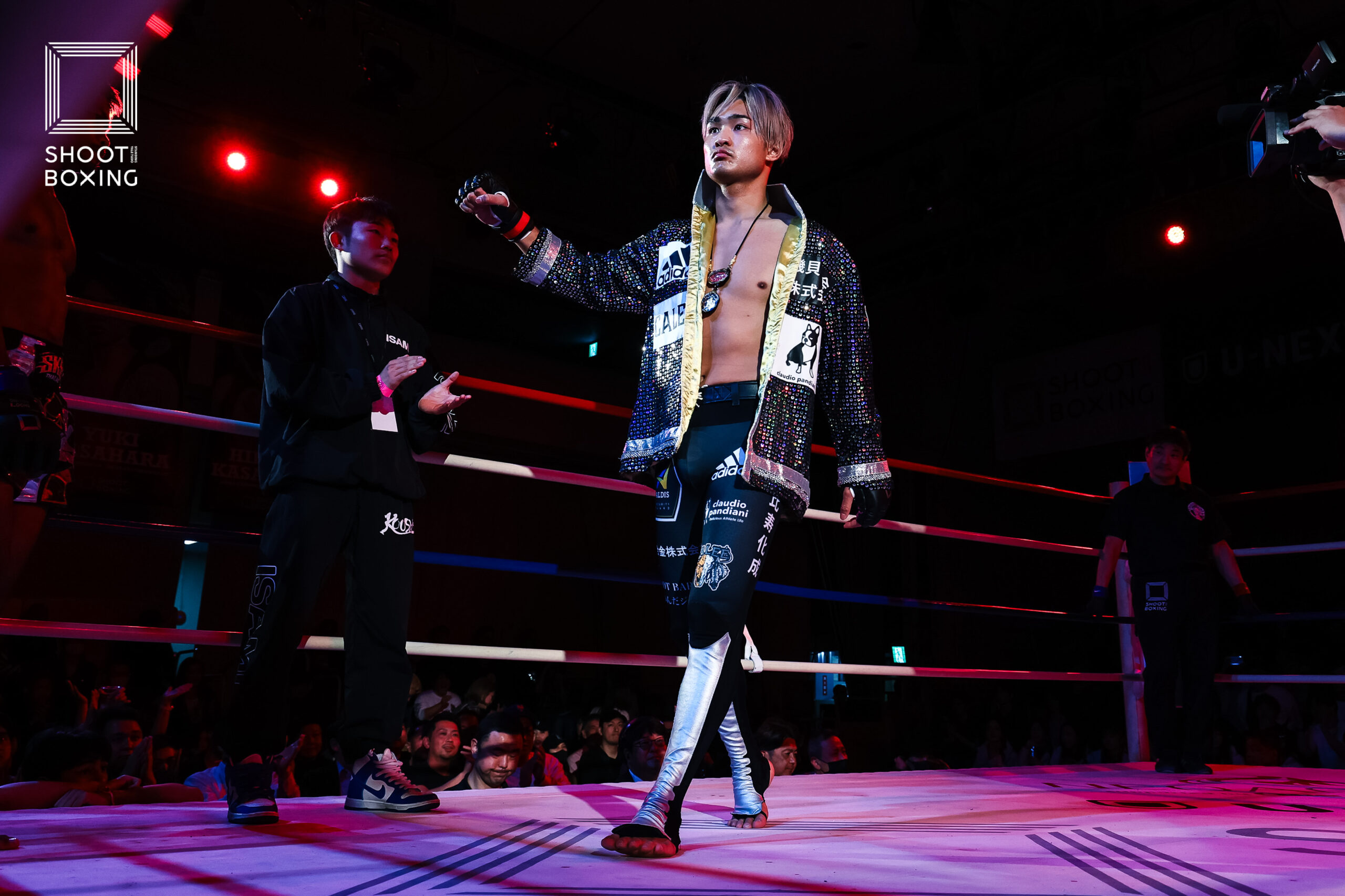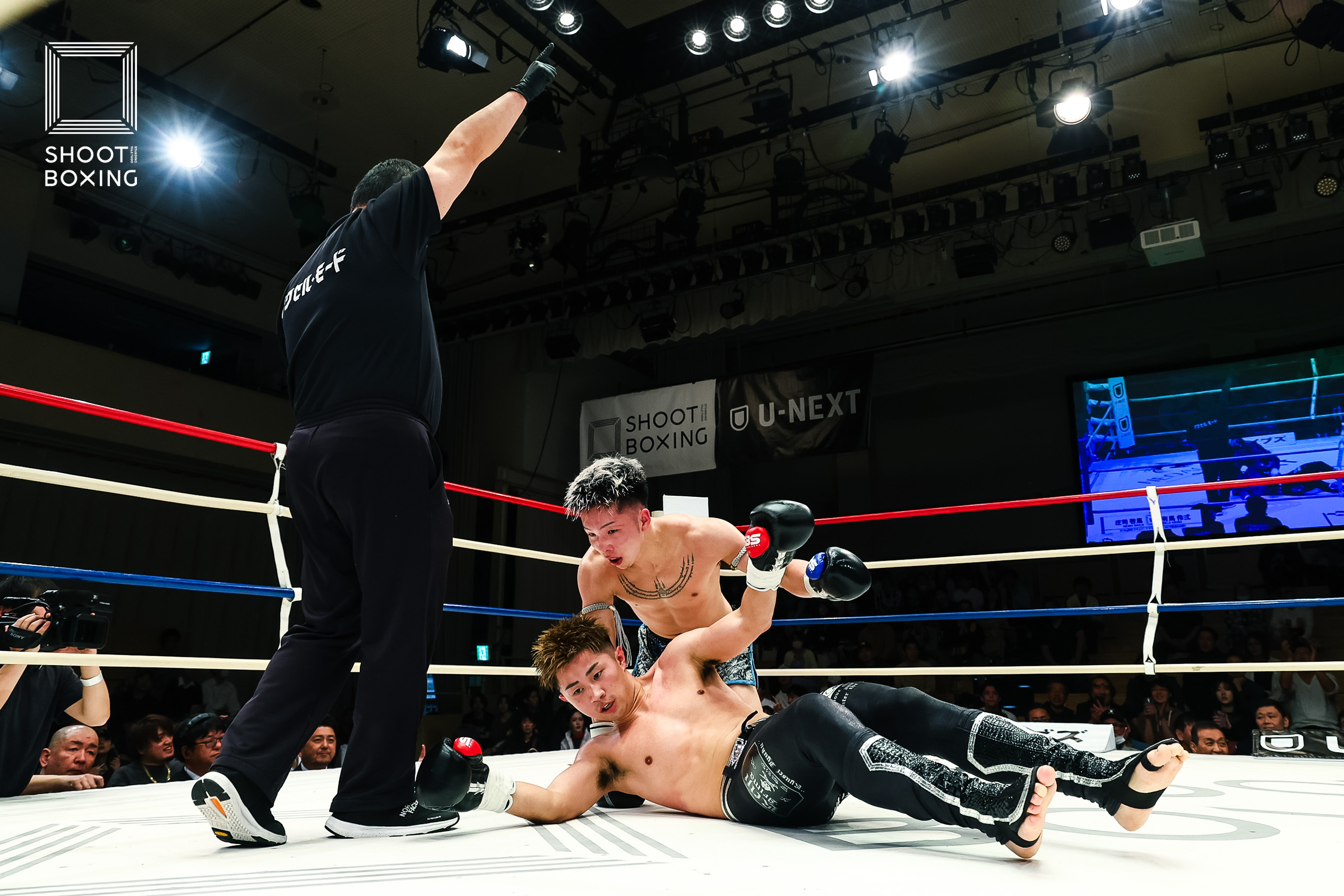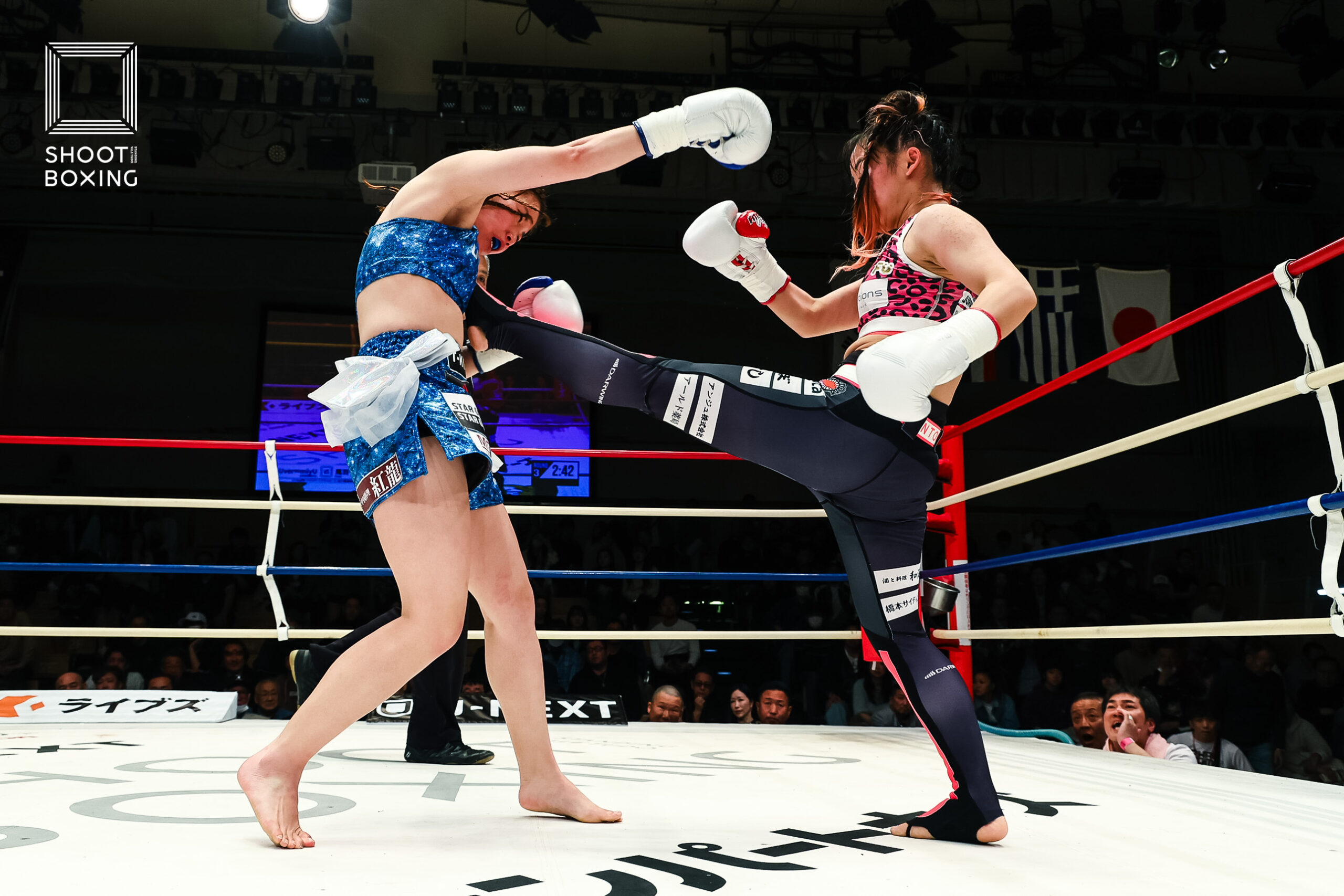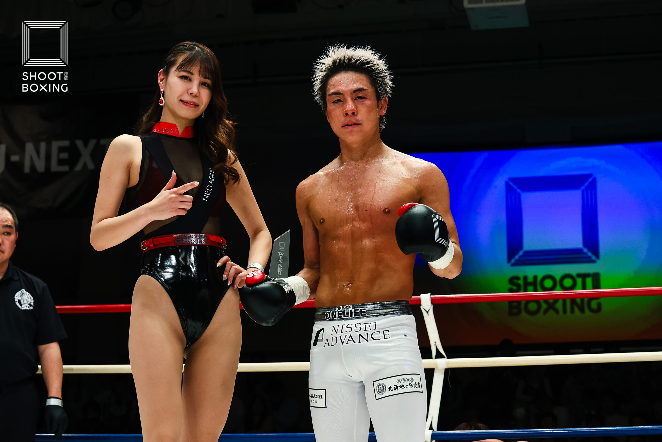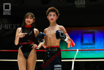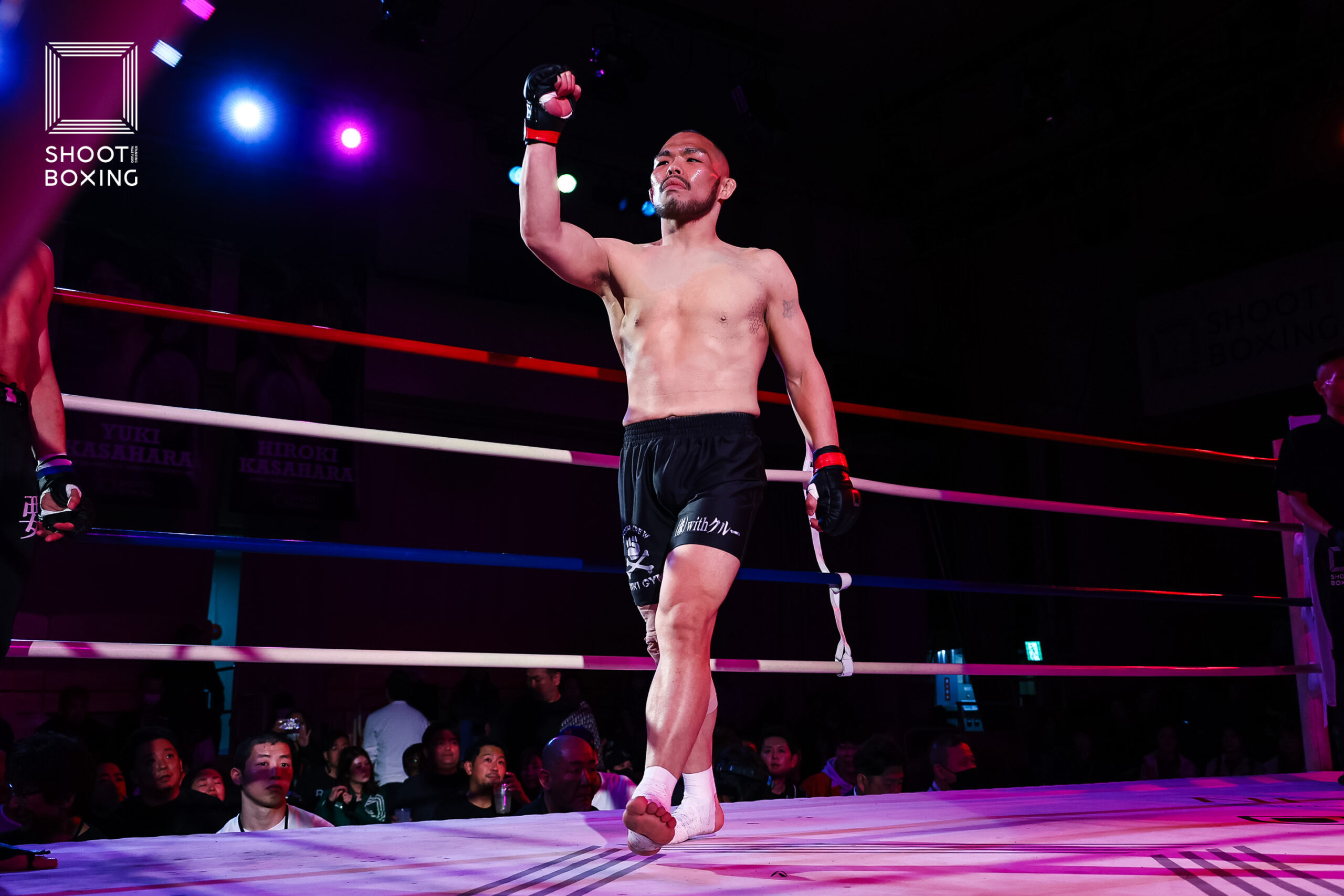 1R、序盤から風羽はパンチとローを上下に散らして揺さぶる。2R、ワンツーで前に出る風羽に、miyUは距離を詰めてパンチ、ヒザ。風羽は積極的に投げにもトライしペースを握る。3Rには風羽はフロントチョークを仕掛ける場面も。miyUも手数を落とすことなく前に出るが、風羽は首投げでシュートポイント奪取。判定で風羽が勝利した。