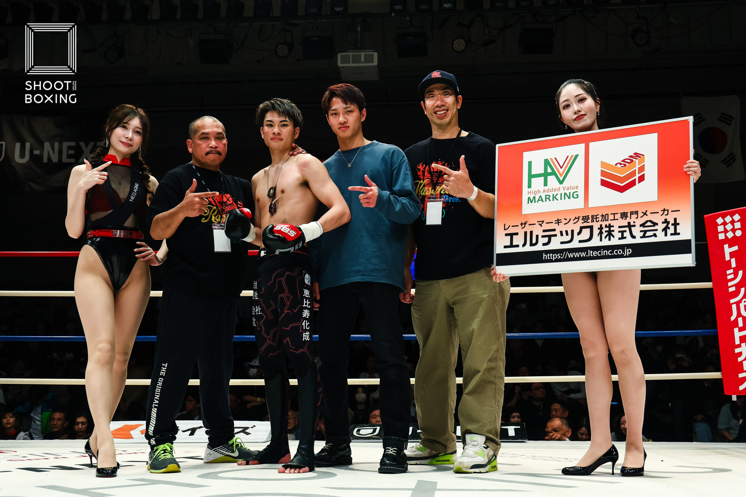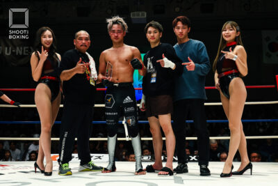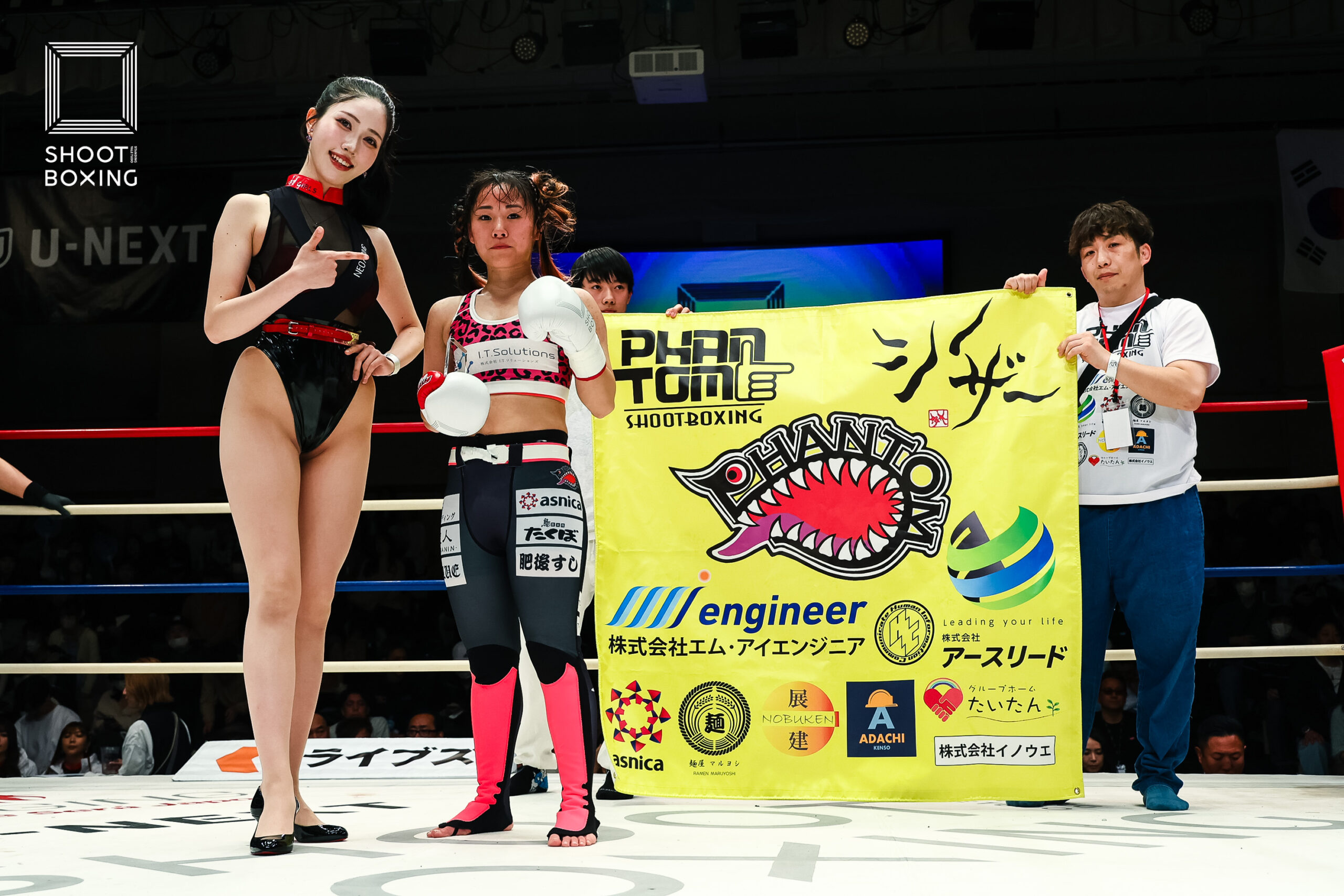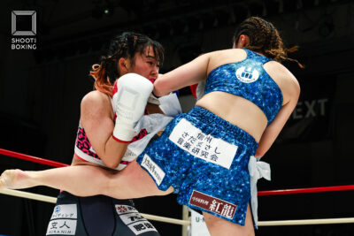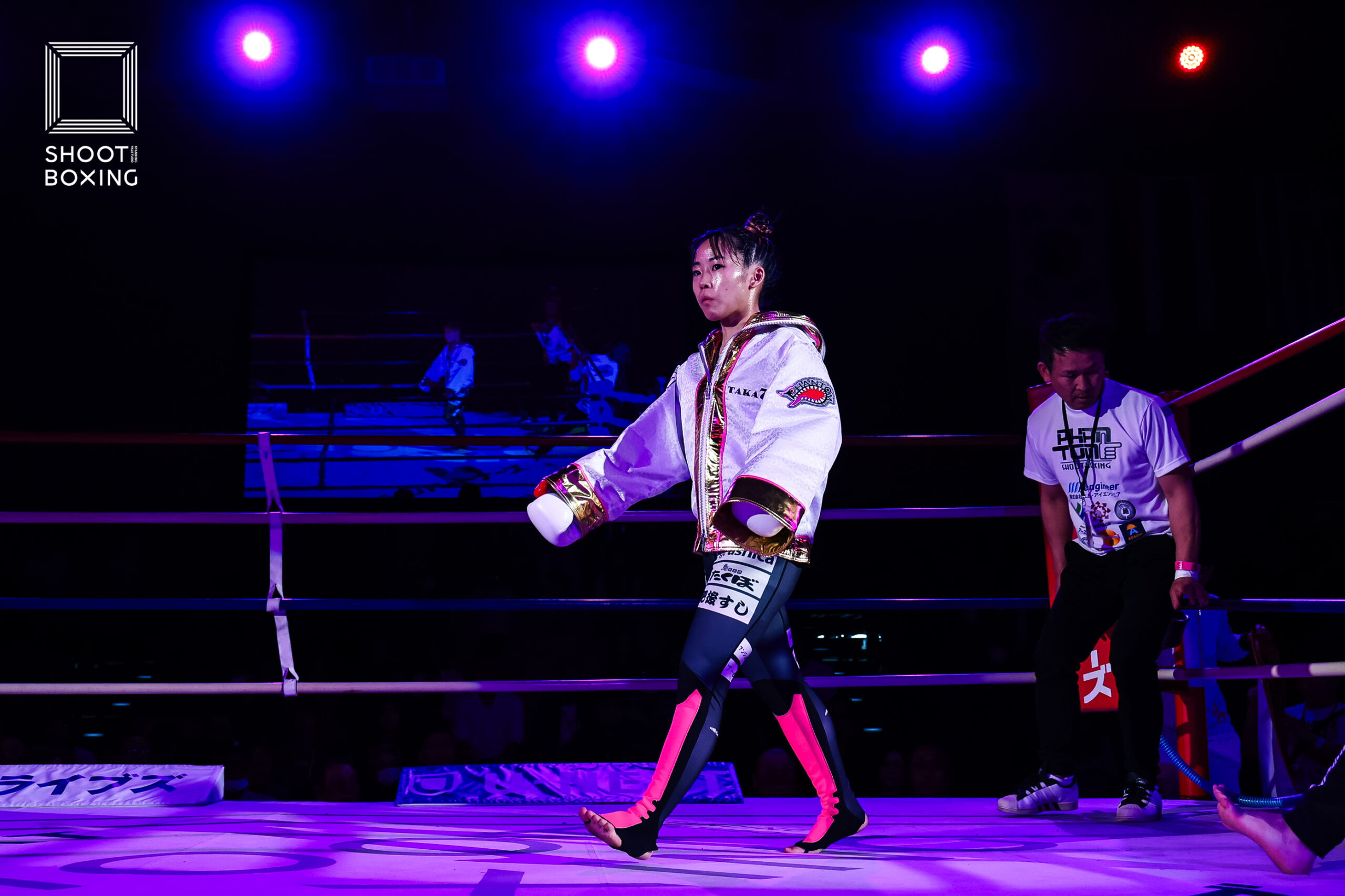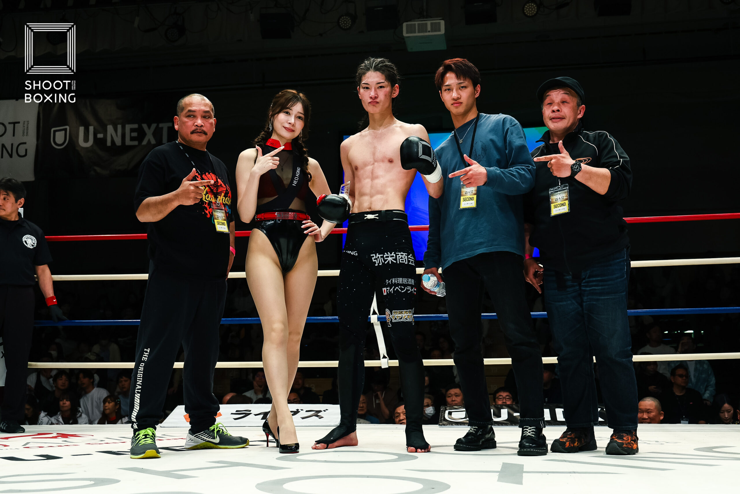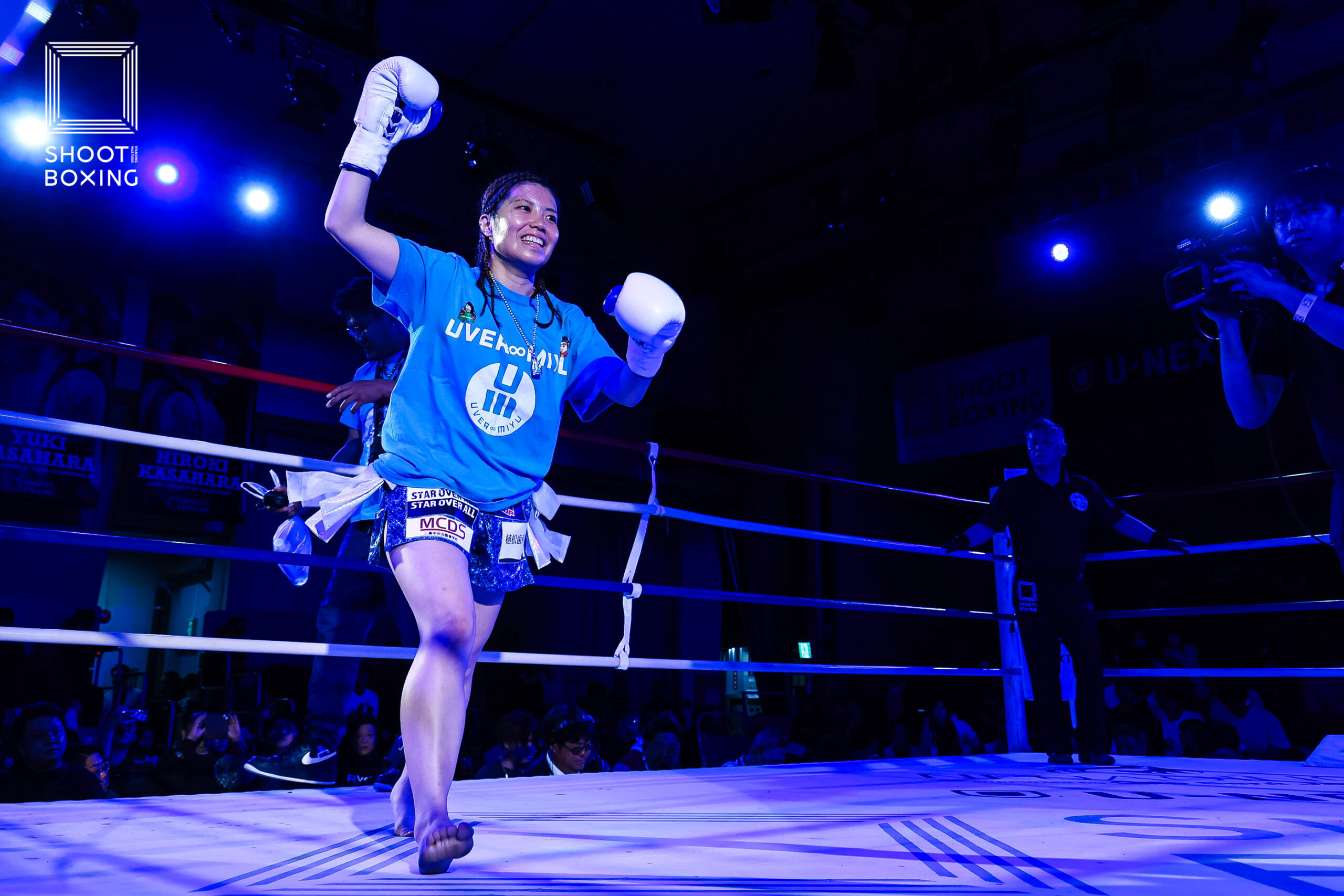 1R、序盤から風羽はパンチとローを上下に散らして揺さぶる。2R、ワンツーで前に出る風羽に、miyUは距離を詰めてパンチ、ヒザ。風羽は積極的に投げにもトライしペースを握る。3Rには風羽はフロントチョークを仕掛ける場面も。miyUも手数を落とすことなく前に出るが、風羽は首投げでシュートポイント奪取。判定で風羽が勝利した。