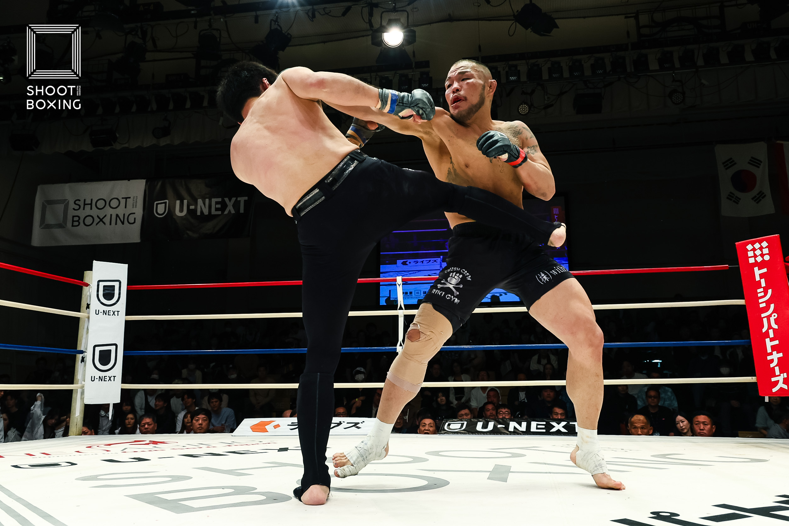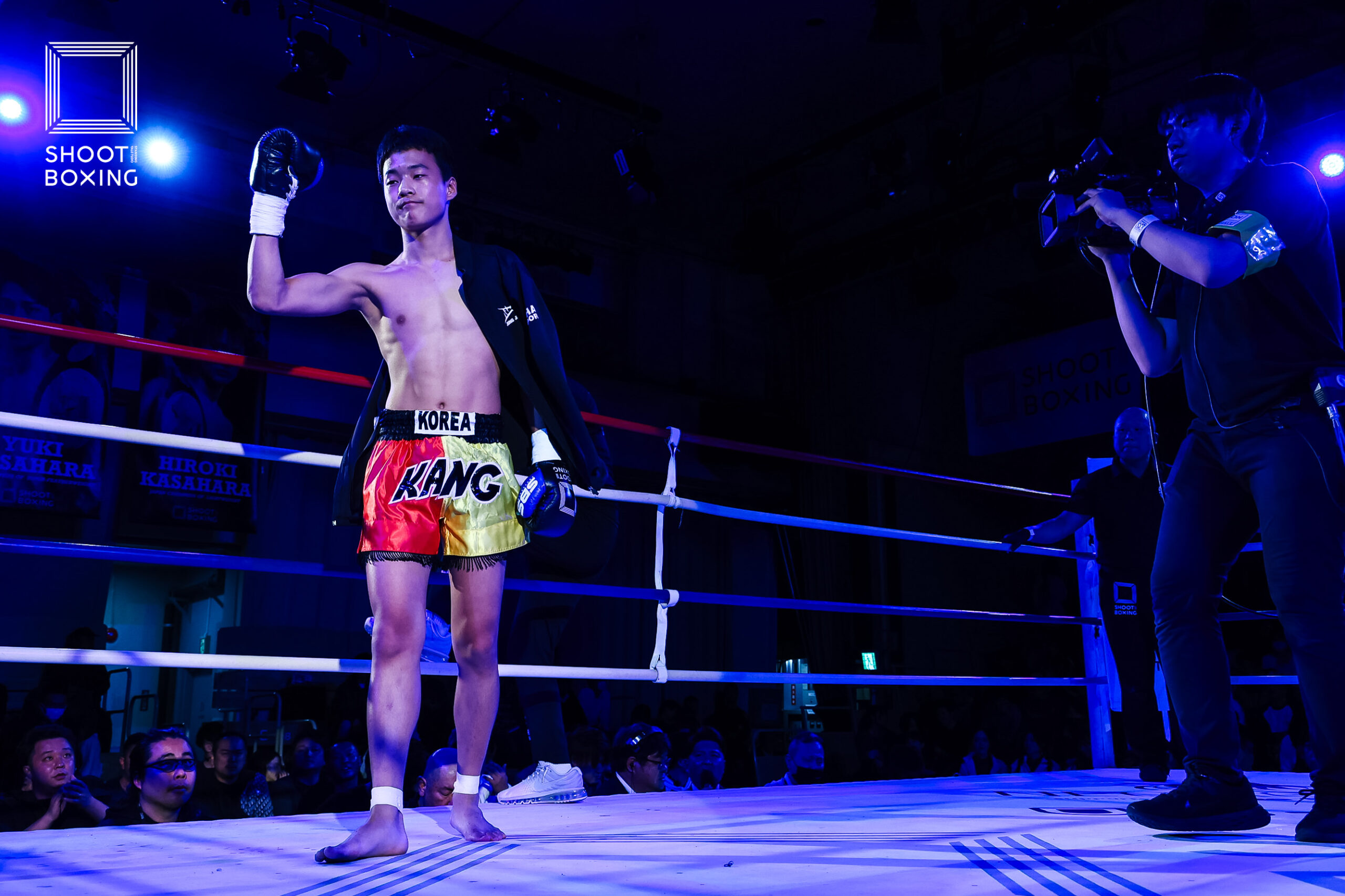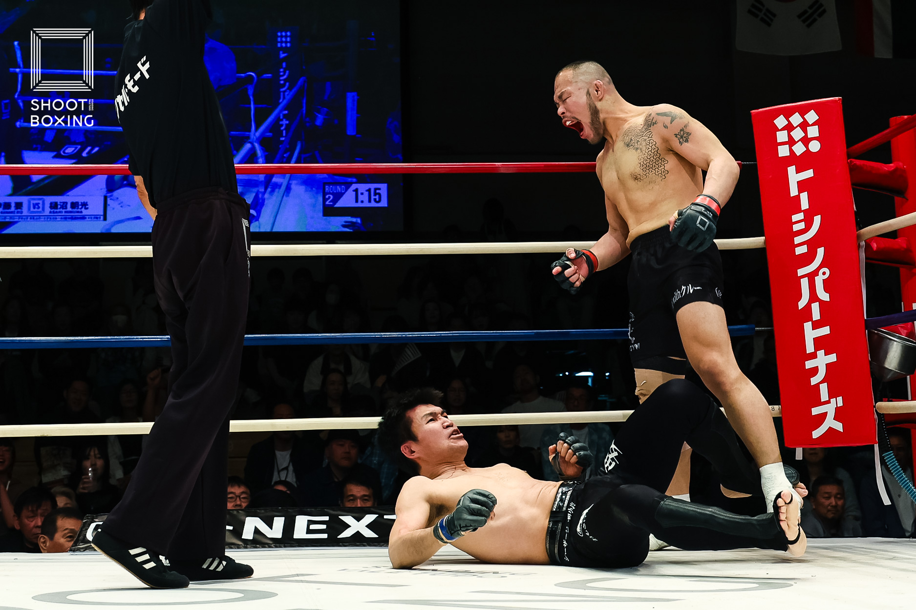 1R、野村は右フックでいきなりダウンを奪うと、強打を浴びせて2度目のダウンを追加。サイドキックでドンヒョンを蹴り飛ばすと、弱弱しい表情のドンヒョンに連打を見舞うと、レフェリーがストップした。
