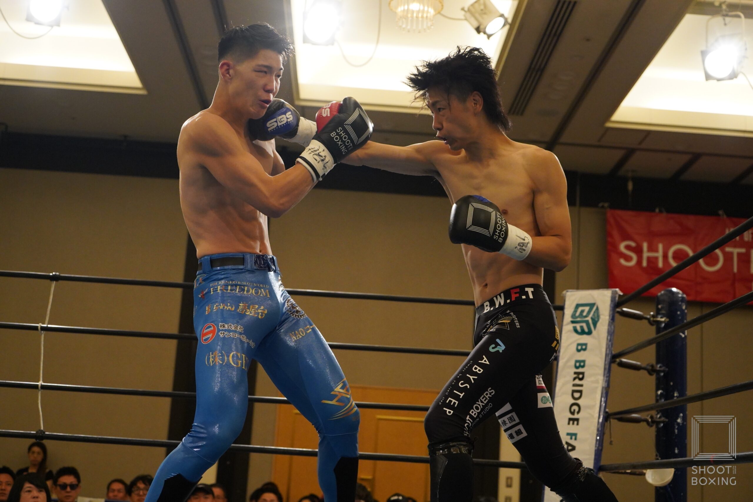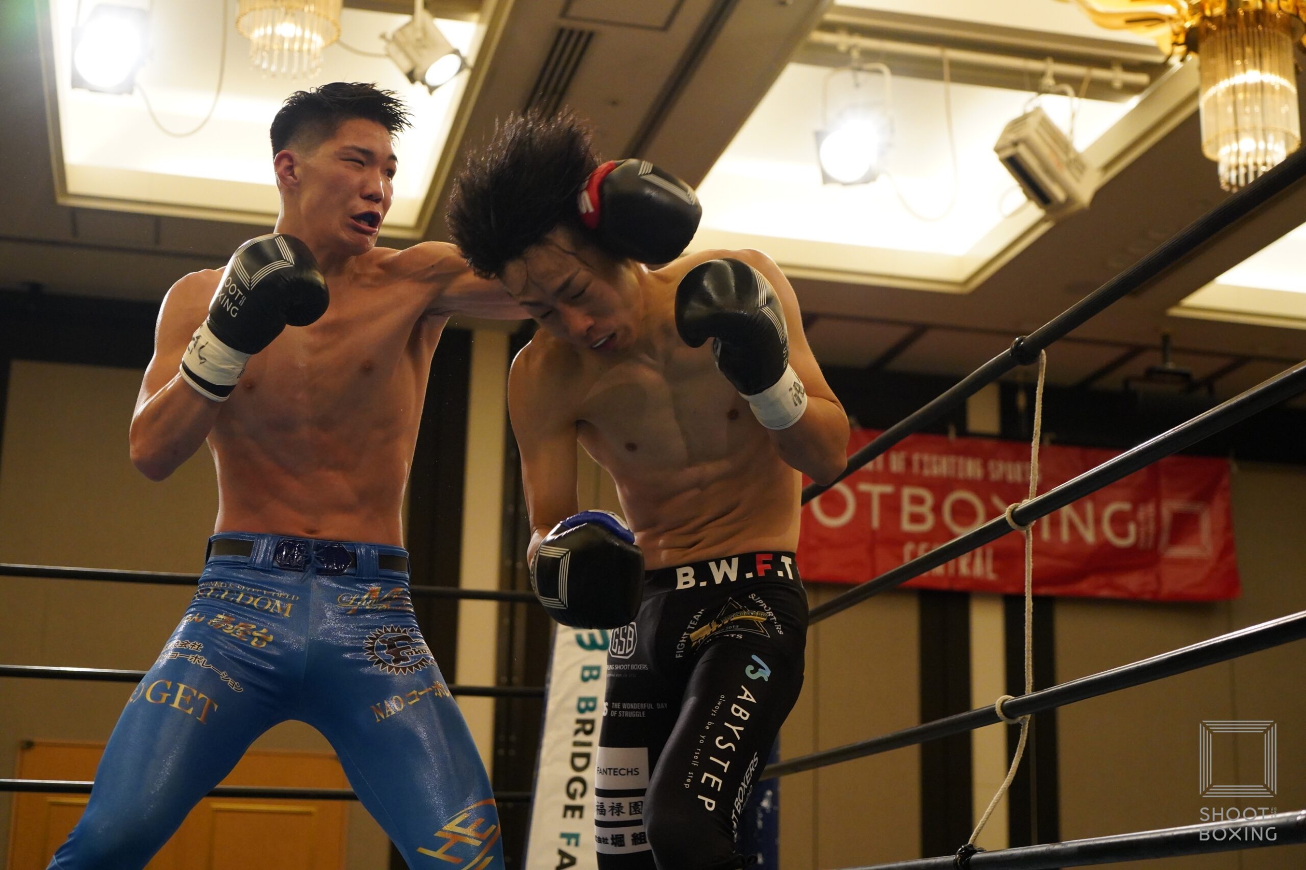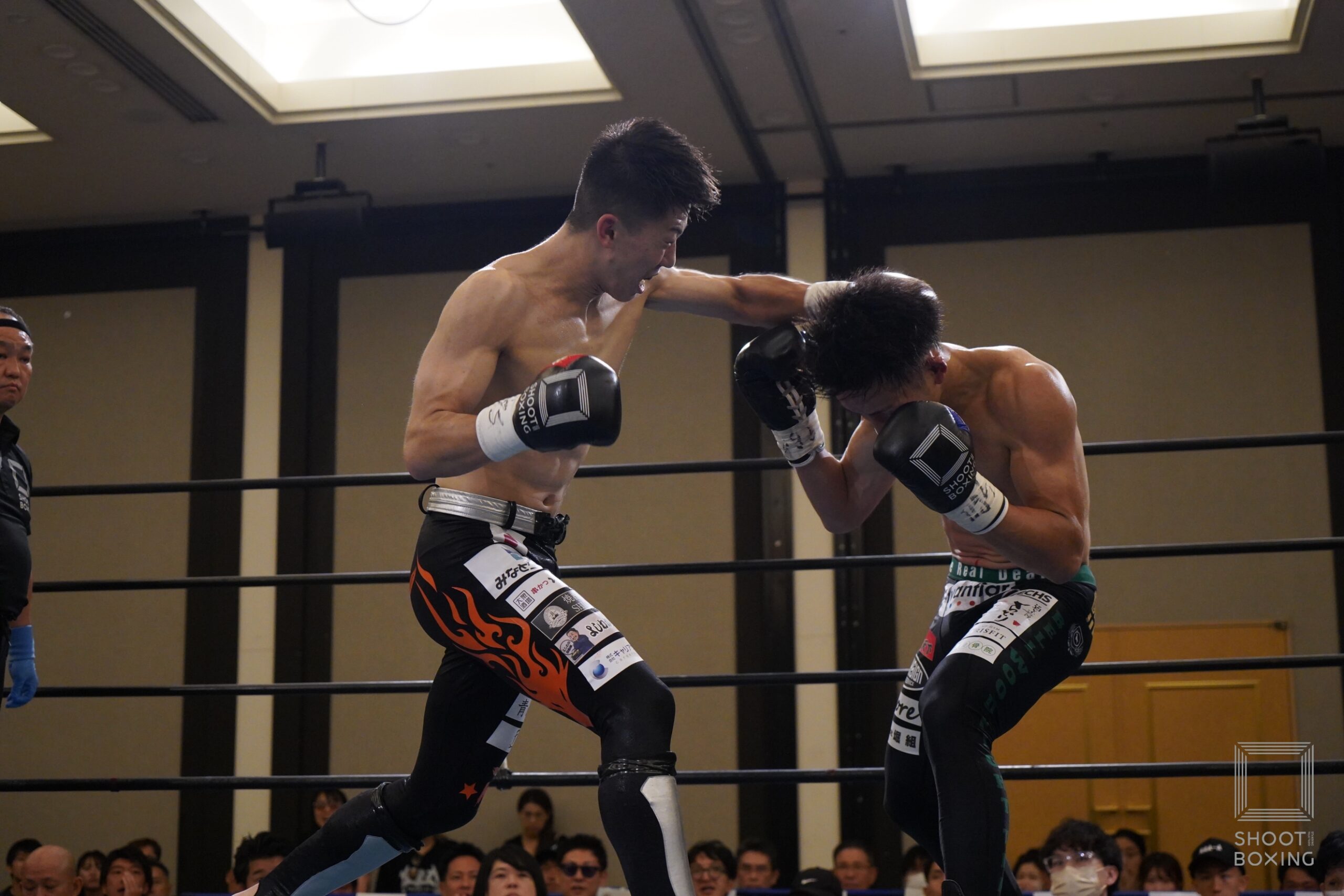 2Rも打ち合いの中で、蓮太が右ハイ。岡本のパンチが当たりはじめて蓮太は鼻血。残り時間僅かのところでもお互いに疲れを見せながらもパンチを交錯させた。