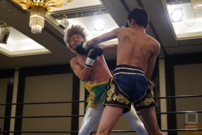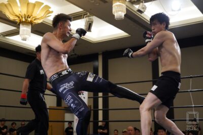 1R、プレスをかける濱田に、啓人は細かく左ジャブを突いて左ロー、ワンツーも当てていく。後手ながらも濱田は右ロー。啓人は下がりながら左フックを当て、残り10秒のところで首投げを見舞ってシュートポイント奪取。