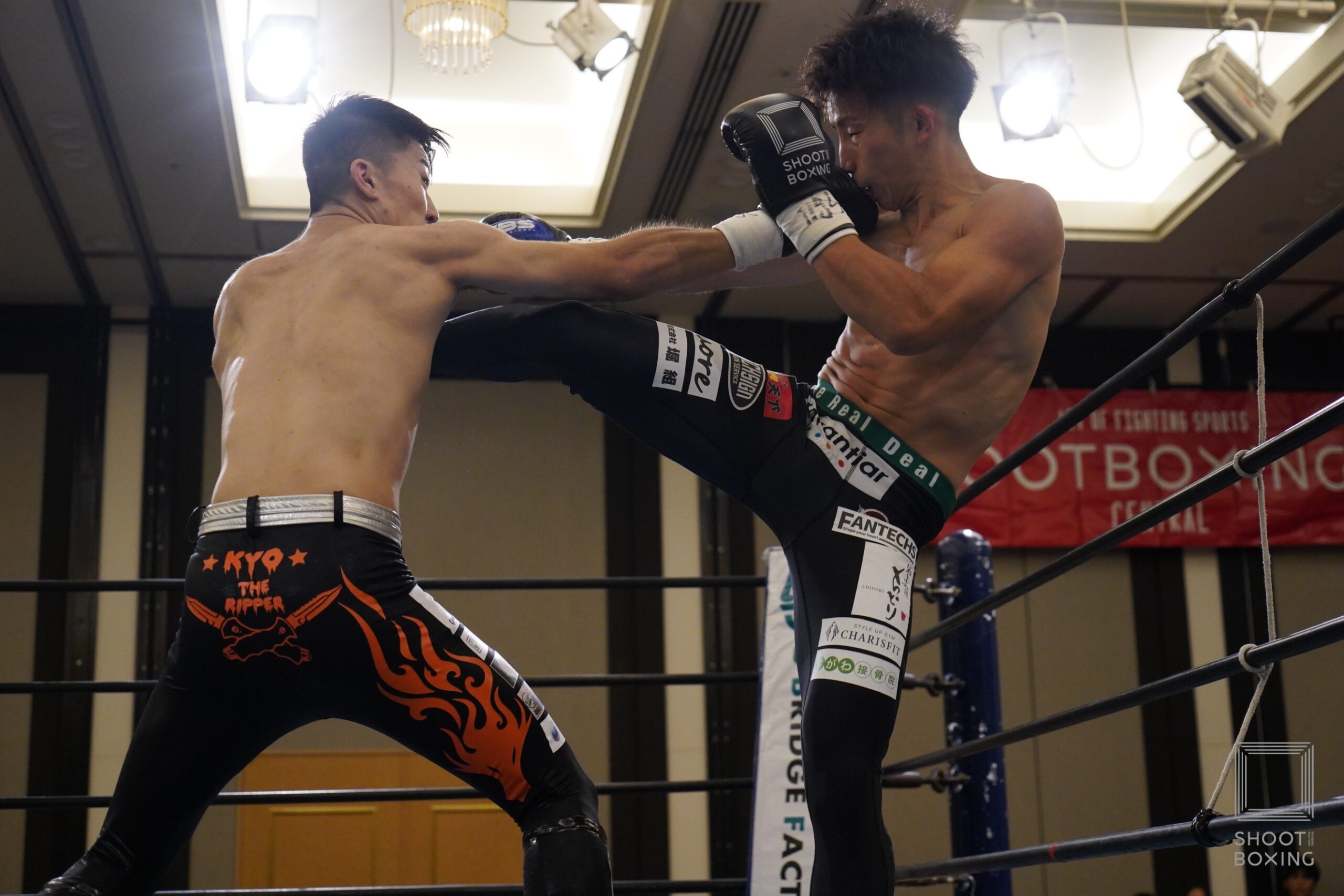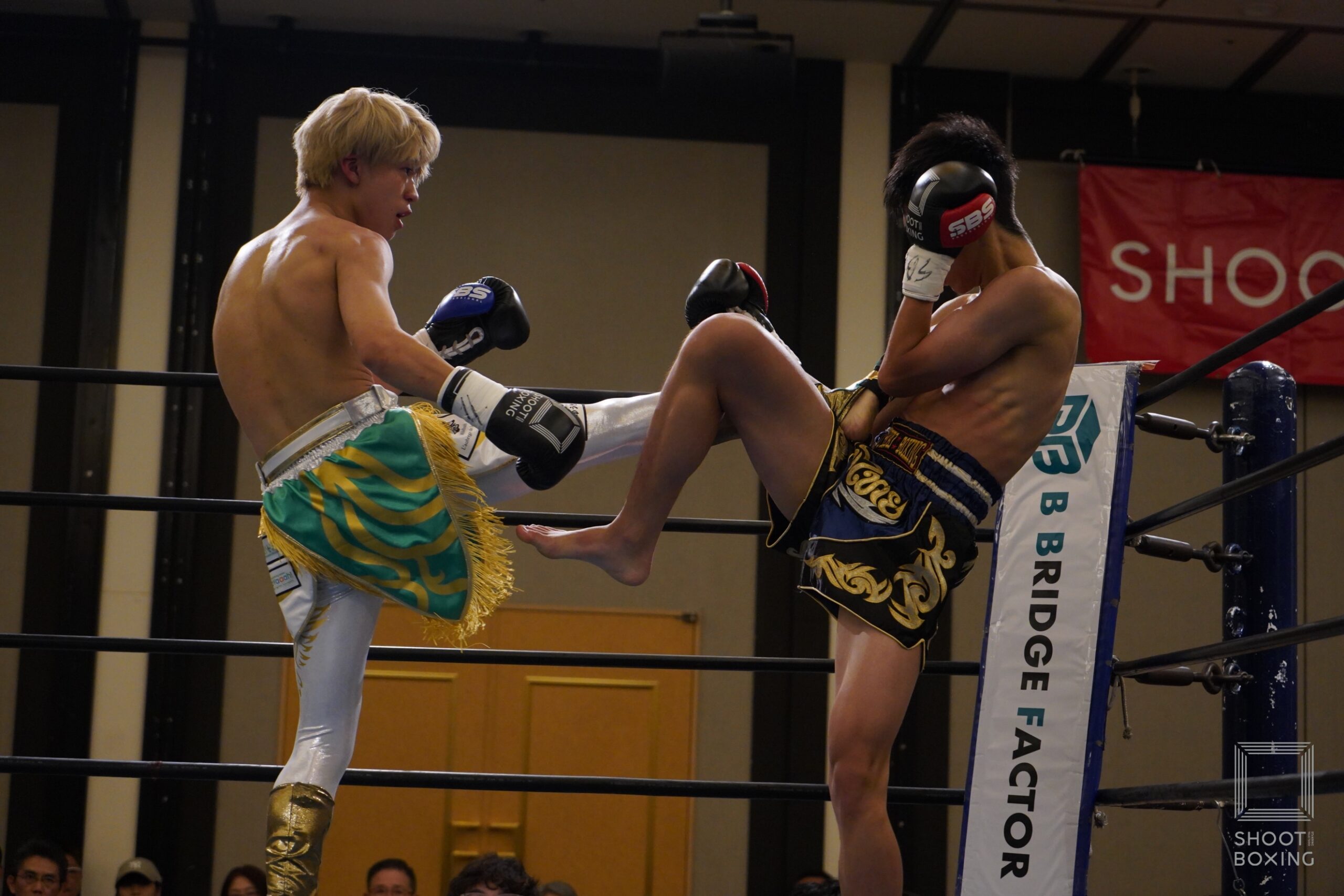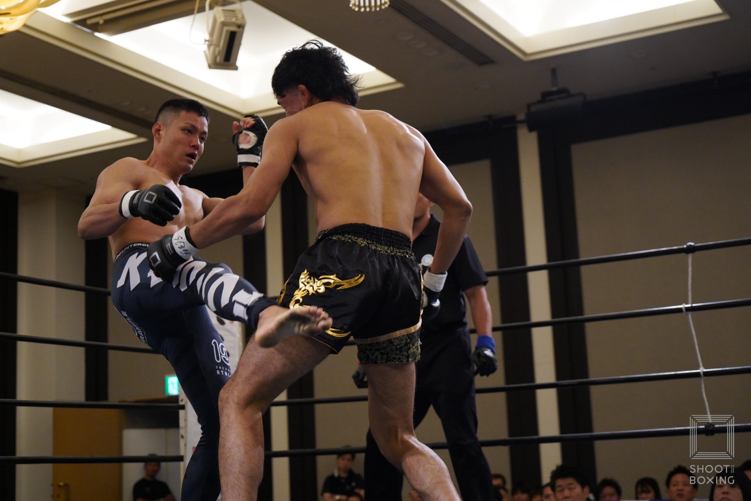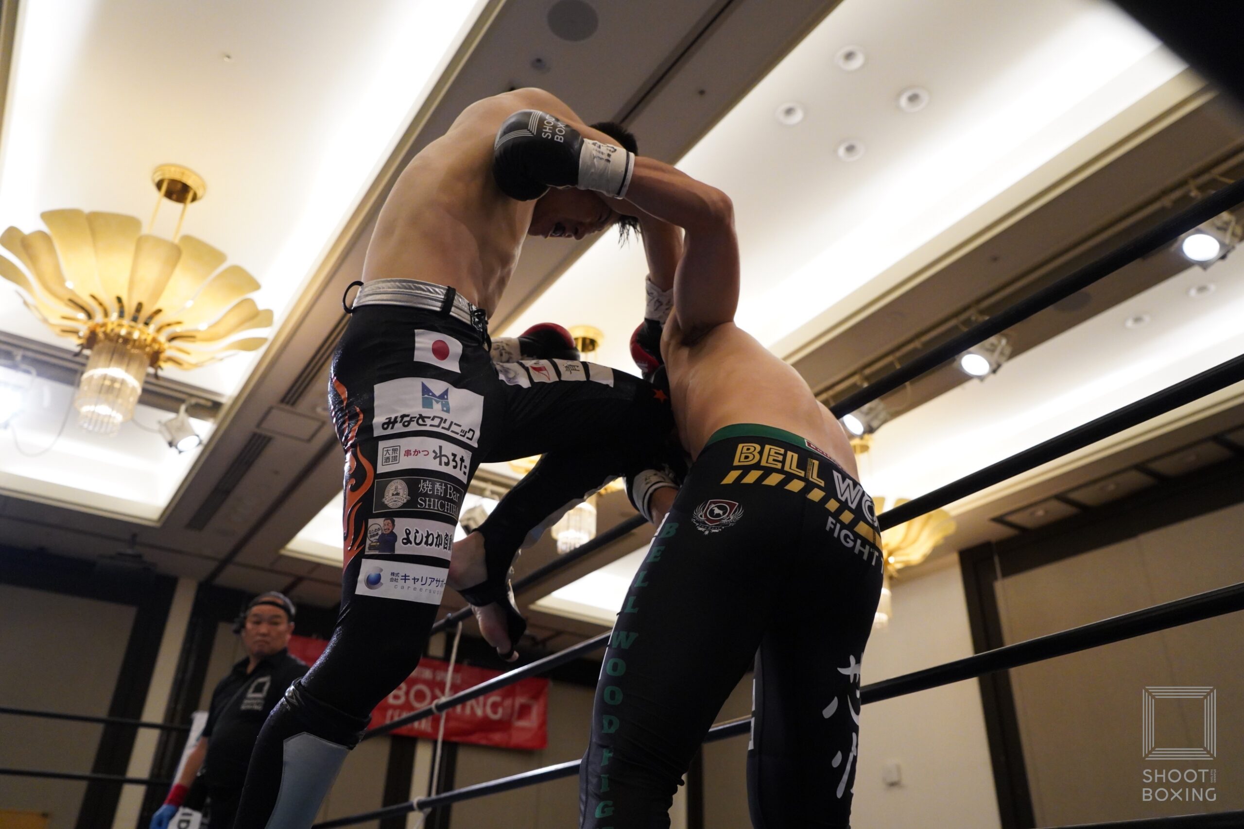 1R、プレスをかける岡本はパンチ主体の攻めを見せ終盤にはラッシュ。久留は冷静にさばいてミドル返す。2R、岡本はワンツー、左ミドルを出しながらじりじりと詰め、久留もジャブ、前蹴り、右ローと攻撃を返してペースを握らせない。3R、手数の減った岡本に、久留は顔面前蹴り、左ミドル、右ローと攻撃を散らしてパンチにつなぐ。最後は久留が顔面前蹴り、ワンツーとヒットさせる場面を作った。判定2-1で久留が勝利。