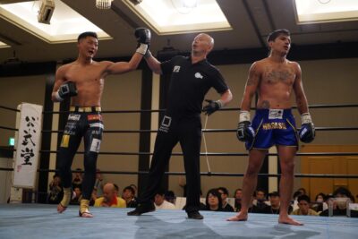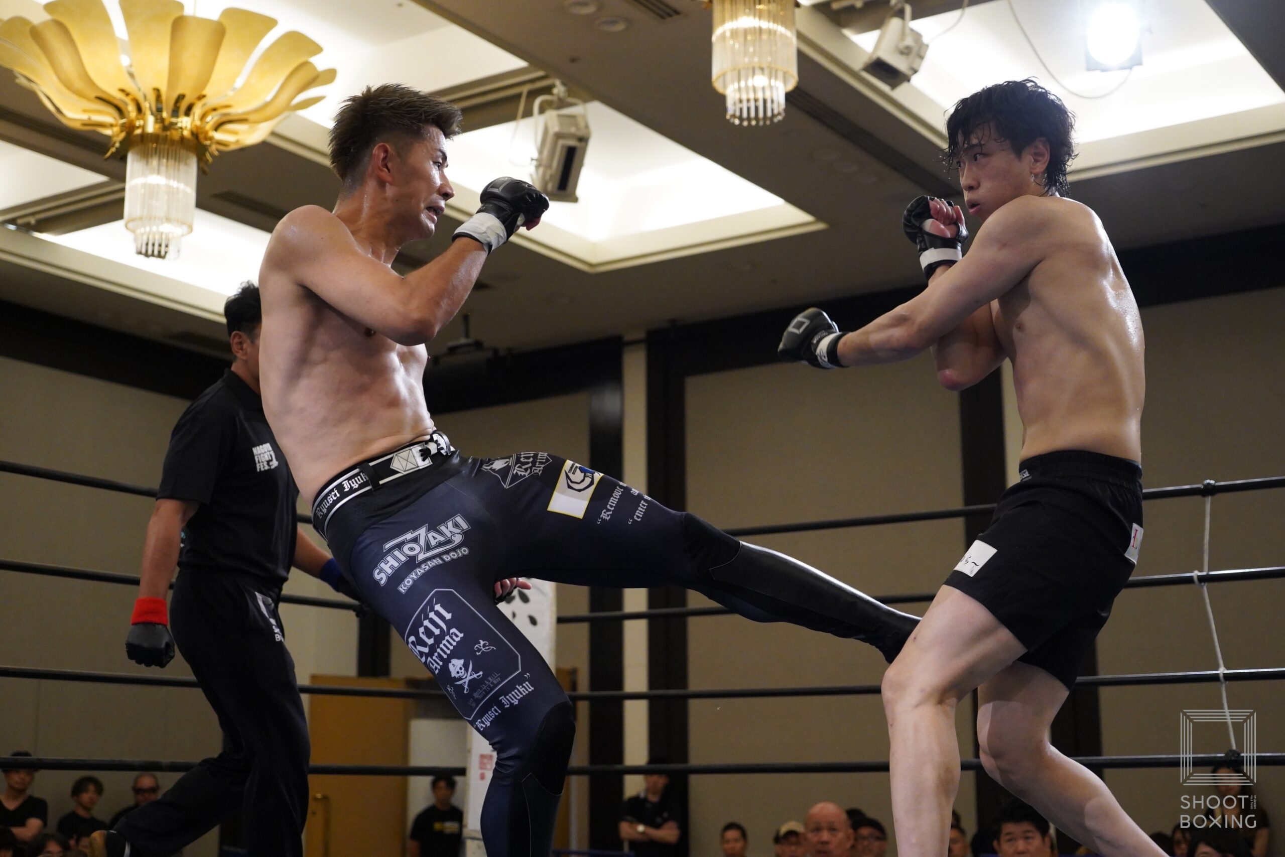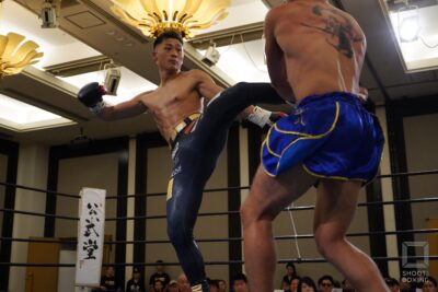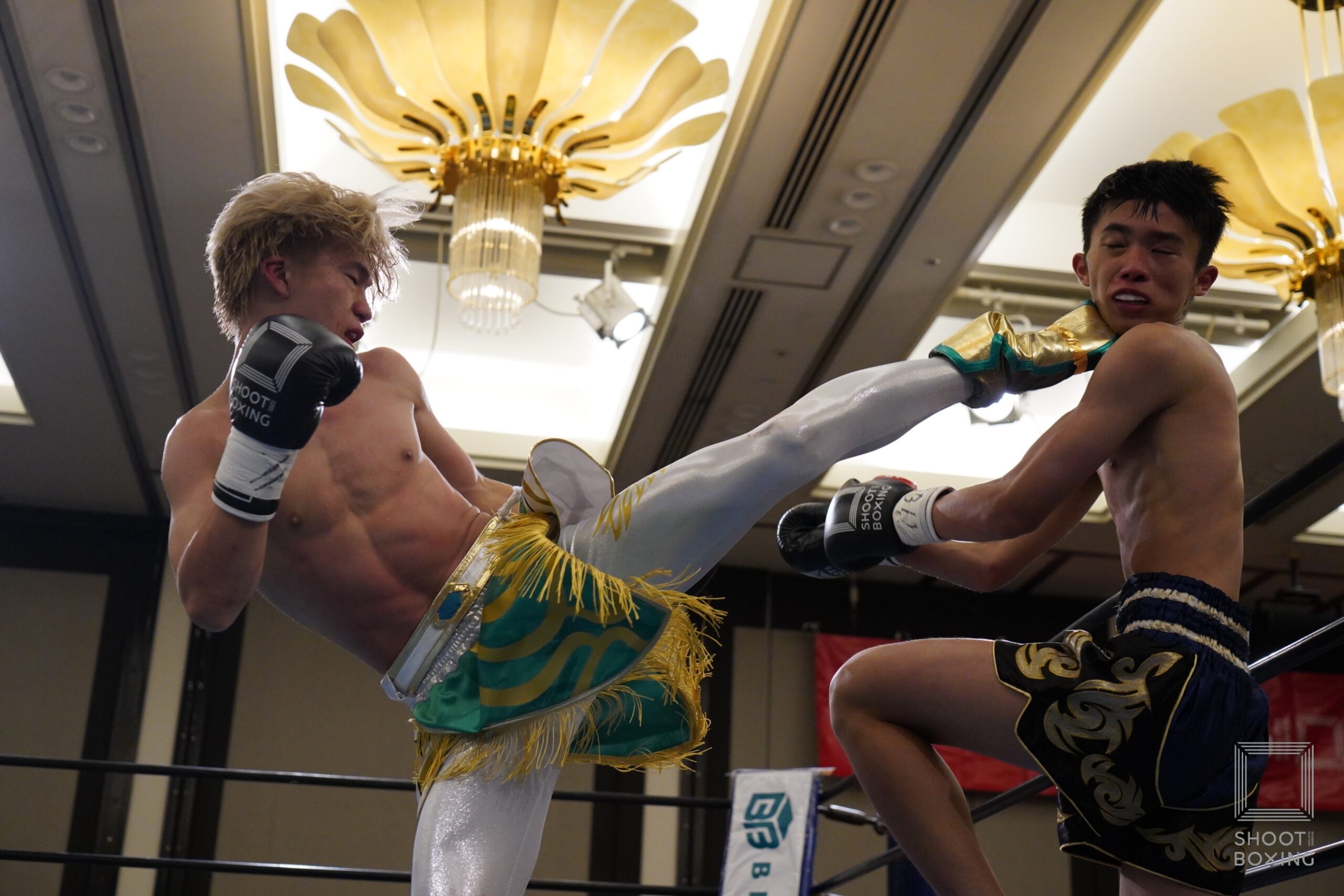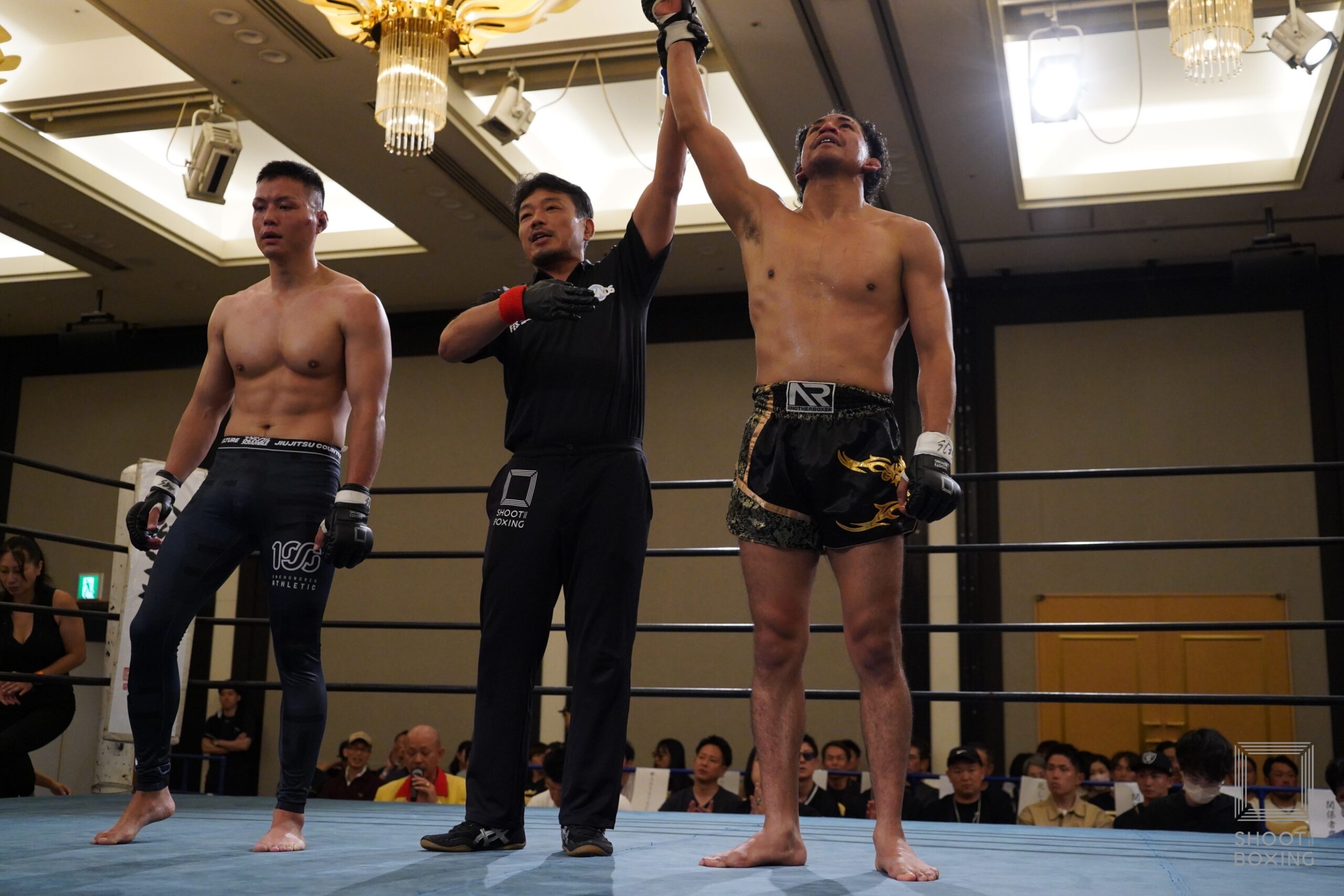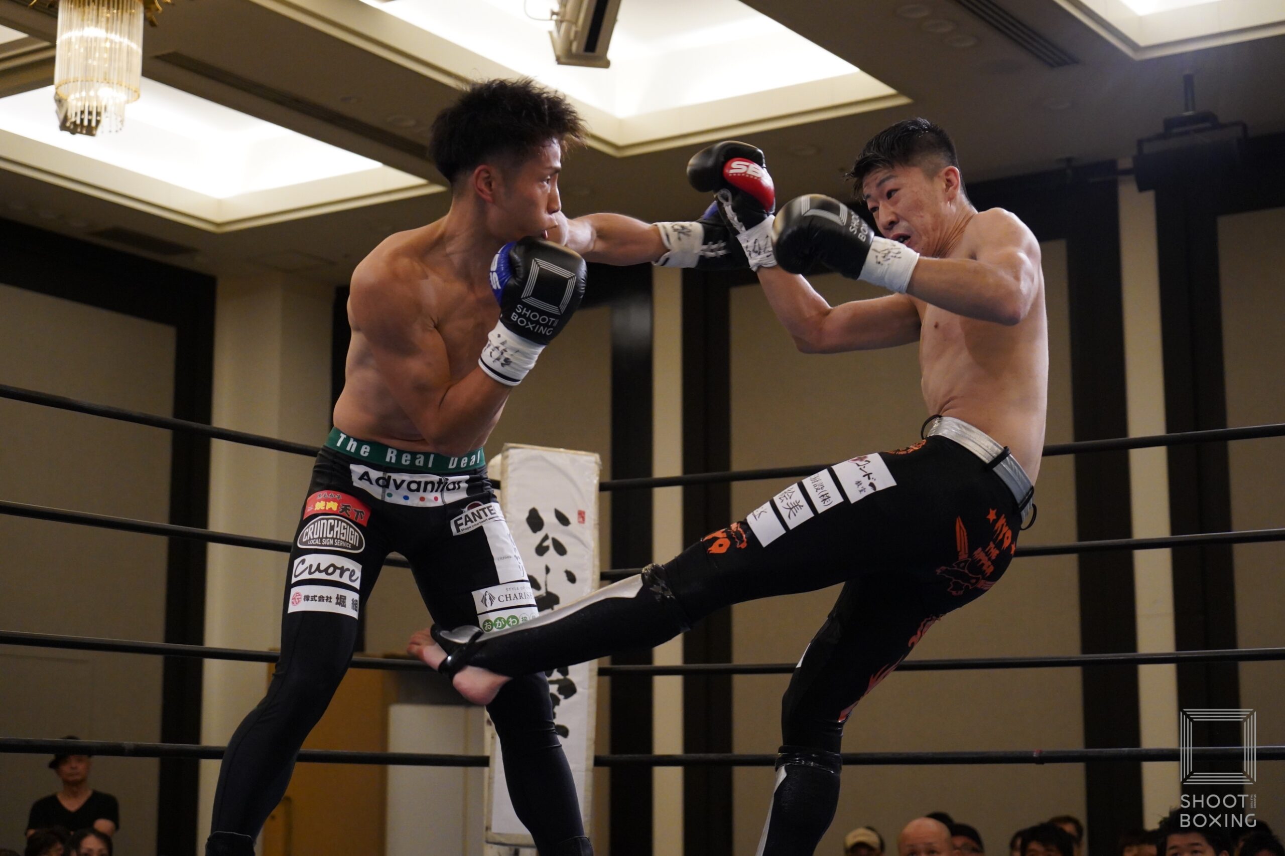 1R、プレスをかける岡本はパンチ主体の攻めを見せ終盤にはラッシュ。久留は冷静にさばいてミドル返す。2R、岡本はワンツー、左ミドルを出しながらじりじりと詰め、久留もジャブ、前蹴り、右ローと攻撃を返してペースを握らせない。3R、手数の減った岡本に、久留は顔面前蹴り、左ミドル、右ローと攻撃を散らしてパンチにつなぐ。最後は久留が顔面前蹴り、ワンツーとヒットさせる場面を作った。判定2-1で久留が勝利。