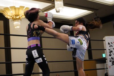 1Rから左右フックを振り回すMOMOに、土井もパンチで応戦し組んでのヒザ。2Rは、土井が積極的に前に出てパンチで押し込んでいく。MOMOは押されながらも右ミドルを返す。3R、お互いに接近戦でパンチを打ち合って試合終了。判定でMOMOが勝利した。