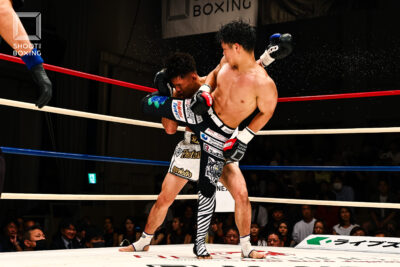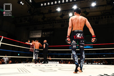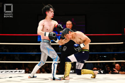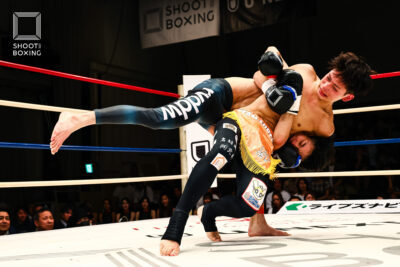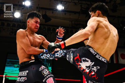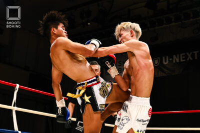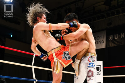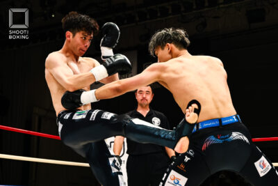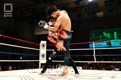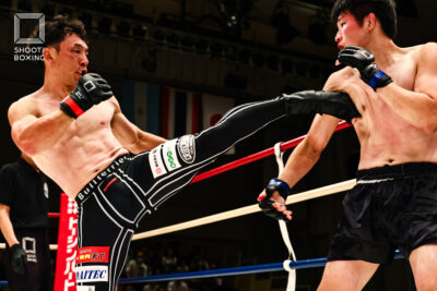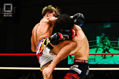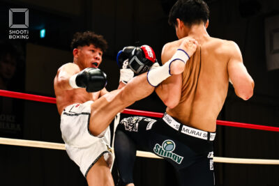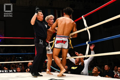 1R、プレッシャーをかける都木が投げを狙うのに対し、身長で上回る荒尾は首相撲からのヒザをこつこつ当てる。2R、3Rとお互いに組み合う展開が続き、本戦はドロー。延長Rも組み合う展開となり、再延長Rへ。ここでも組んでのヒザを当てる展開となり、随所でミドルを当てた都木が接戦を制した。