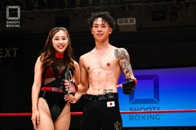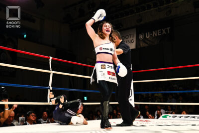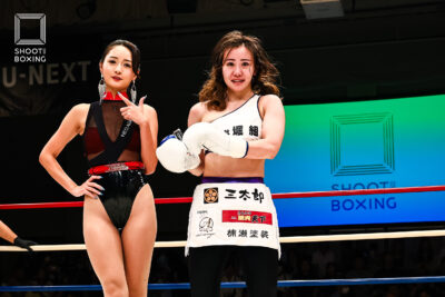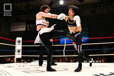 1R、パンチで突っ込んでくる坂本に対し、ユリカは首相撲からのヒザの徹底した攻め。2Rには肩固めも狙うユリカに、坂本はパンチで攻めるも首相撲に捕まる展開に。3R、打ち合いに行く坂本は、組んでくるユリカに首投げを決めてシュートポイント奪取。これが決定打となり、坂本が判定勝ちした。