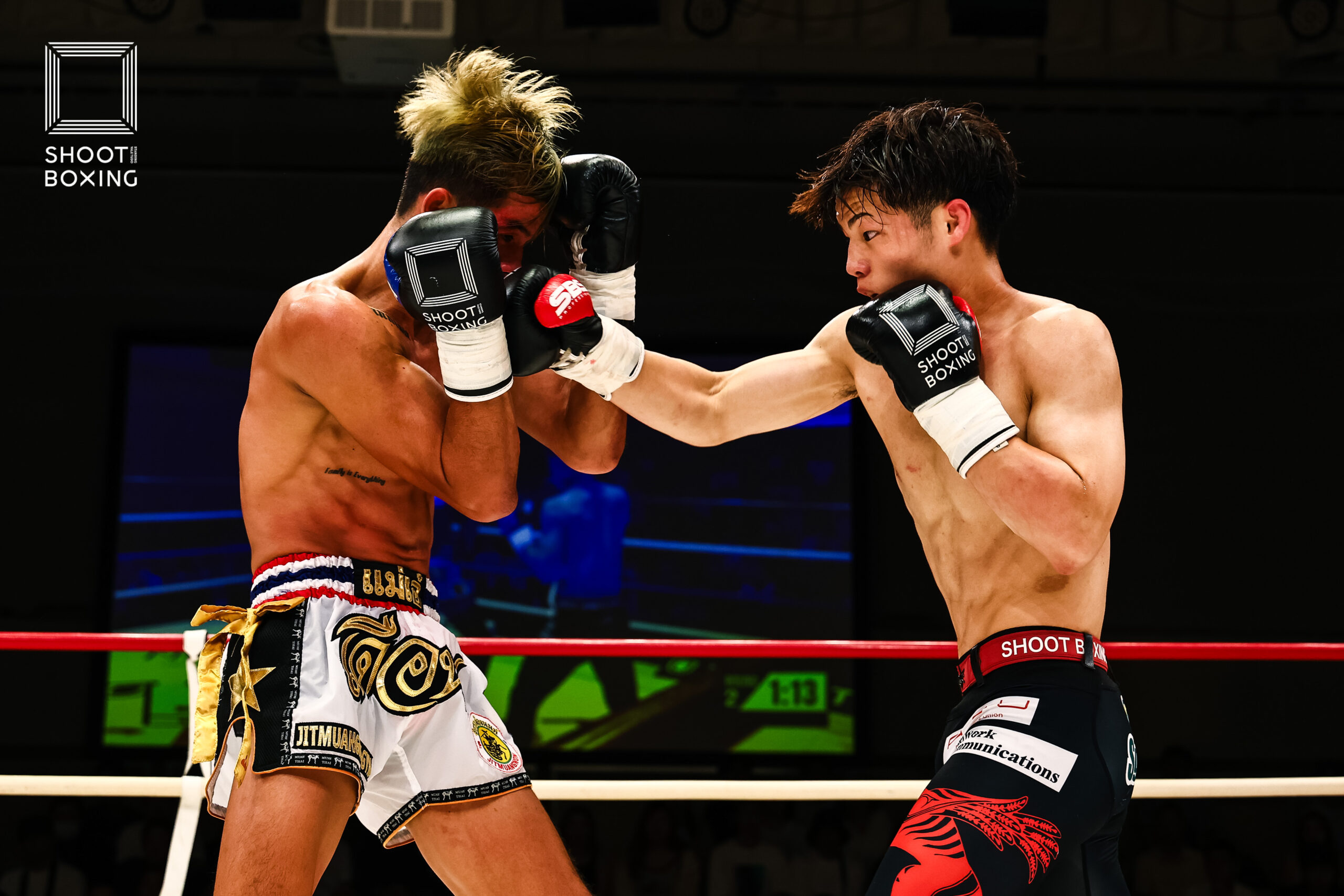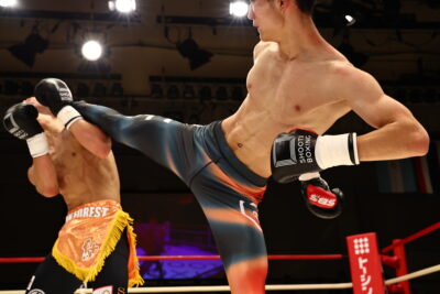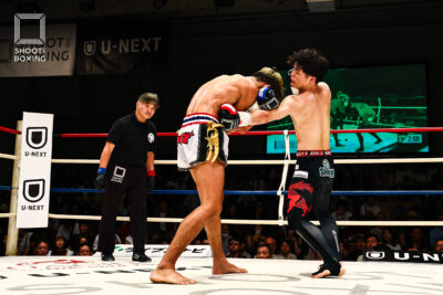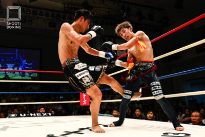 1R、虎矢太は左ボディを何度も炸裂させて削っていくが、ペップンソンは耐えて左ミドル、右ローを返すが虎矢太の勢いにのまれてしまう。