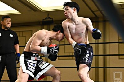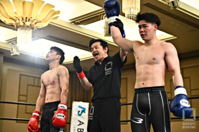 1R、プレスをかける森園はローで前進し、土井は右ストレート、左フック、右ミドルと多彩な攻めで主導権を握る。2R、土井は右ローをこつこつ当て、右ストレート、左フックをクリーンヒットさせるが、タフな森園は倒れず打ち返して組み付くと投げも狙う。3Rも手数とクリーンヒットで上回る土井がペースを握るものの、森園はタフさを見せて前に出続ける。最後まで土井は仕留め切れなかったが、判定勝ちを収めた。