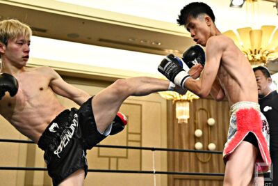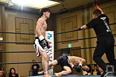 お互いに激しい打撃戦。パンチのDAIYAに、内野はプレスを強めてリーチを活かした左ストレート、左ミドル、ハイと蹴りを散らす。2Rも激しい打ち合いの中、内野が組んでのヒザ蹴りをDAIYAのボディにめり込ませると、DAIYAは悶絶。内野がKO勝ちした。