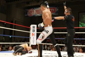 2018年シリーズ開幕戦のメインを飾るのは、新エースとなった海人。過去、鈴木博昭に3戦3勝、MASAYAをKOに葬っている“SBキラー”のタップロンと対戦した。1Rは互いに様子を見ていたが、2Rにタップロンの右フック強打で海人が一瞬グラつく。この一撃で海人は試合後までの記憶が一切なくなったという。それでもファイターの本能で戦いを続ける海人は、パンチでボディを攻めていく。タップロンは的確で強い左ミドルを蹴り、パンチにつなげる。ややタップロン有利な展開で進む中、4Rに海人が右ヒジをヒットさせ、右ボディストレートを突き刺す。その直後、ボディストレートをフェイントにしての右フックがクリーンヒット。すかさずパンチでラッシュをかけた海人が首相撲からヒザ蹴りを連打するとタップロンはダウン。立ち上がることが出来ず、海人がSBキラーをKOで葬った。